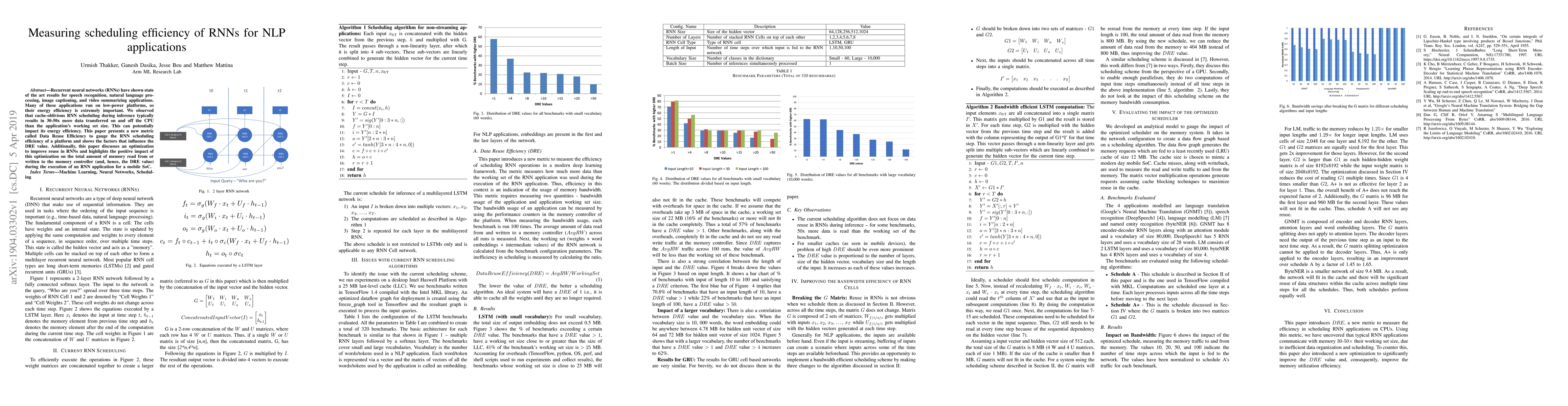 Recurrent neural networks (RNNs) have shown state of the art results for speech recognition, natural language processing, image captioning and video summarizing applications. Many of these applications run on low-power platforms, so their energy efficiency is extremely important. We observed that cache-oblivious RNN scheduling during inference typically results in 30-50x more data transferred on and off the CPU than the application's working set size. This can potentially impact its energy efficiency. This paper presents a new metric called Data Reuse Efficiency to gauge the RNN scheduling efficiency of a platform and shows the factors that influence the DRE value. Additionally, this paper discusses an optimization to improve reuse in RNNs and highlights the positive impact of this optimization on the total amount of memory read from or written to the memory controller (and, hence, the DRE value) during the execution of an RNN application for a mobile SoC.