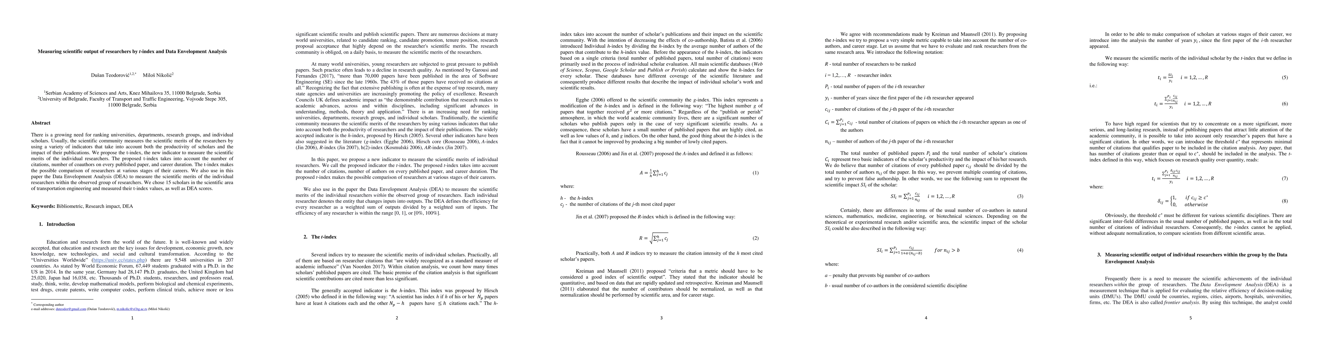 There is a growing need for ranking universities, departments, research groups, and individual scholars. Usually, the scientific community measures the scientific merits of the researchers by using a variety of indicators that take into account both the productivity of scholars and the impact of their publications. We propose the t-index, the new indicator to measure the scientific merits of the individual researchers. The proposed t-index takes into account the number of citations, number of coauthors on every published paper, and career duration. The t-index makes the possible comparison of researchers at various stages of their careers. We also use in this paper the Data Envelopment Analysis (DEA) to measure the scientific merits of the individual researchers within the observed group of researchers. We chose 15 scholars in the scientific area of transportation engineering and measured their t-index values, as well as DEA scores.