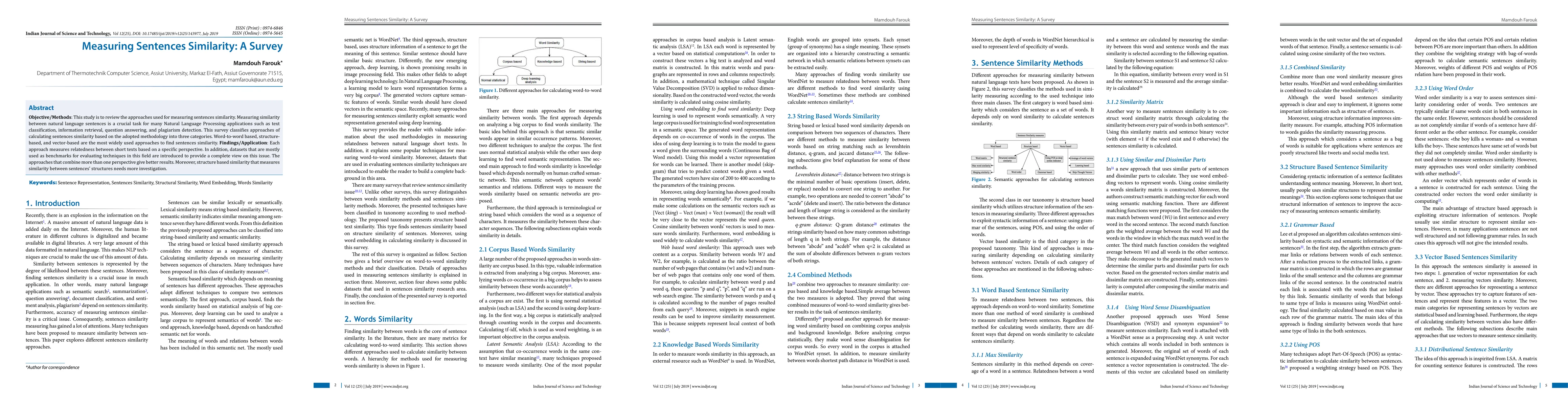 This paper surveys methods for measuring sentence similarity, categorizing them into word-to-word, structure-based, and vector-based approaches, and highlights the benefits of combining multiple perspectives for improved results. It also discusses commonly used datasets for benchmarking these techniques.