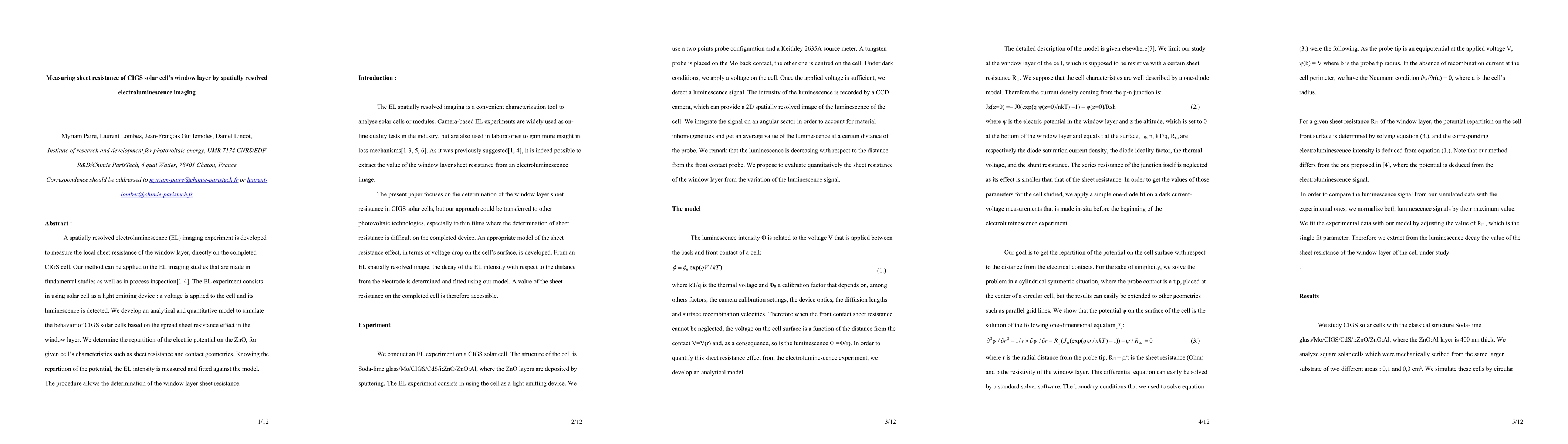 A spatially resolved electroluminescence (EL) imaging experiment is developed to measure the local sheet resistance of the window layer, directly on the completed CIGS cell. Our method can be applied to the EL imaging studies that are made in fundamental studies as well as in in-line process inspection (1-3). The EL experiment consists in using solar cell as a light emitting device : a voltage is applied to the cell and its luminescence is detected. We develop an analytical and quantitative model to simulate the behavior of CIGS solar cells based on the spread sheet resistance effect in the window layer. We determine the repartition of the electric potential on the ZnO, for given cell's characteristics such as sheet resistance and contact geometries. Knowing the repartition of the potential, the EL intensity is estimated and the experimental EL signal is fitted, which allows the determination of the window layer sheet resistance.