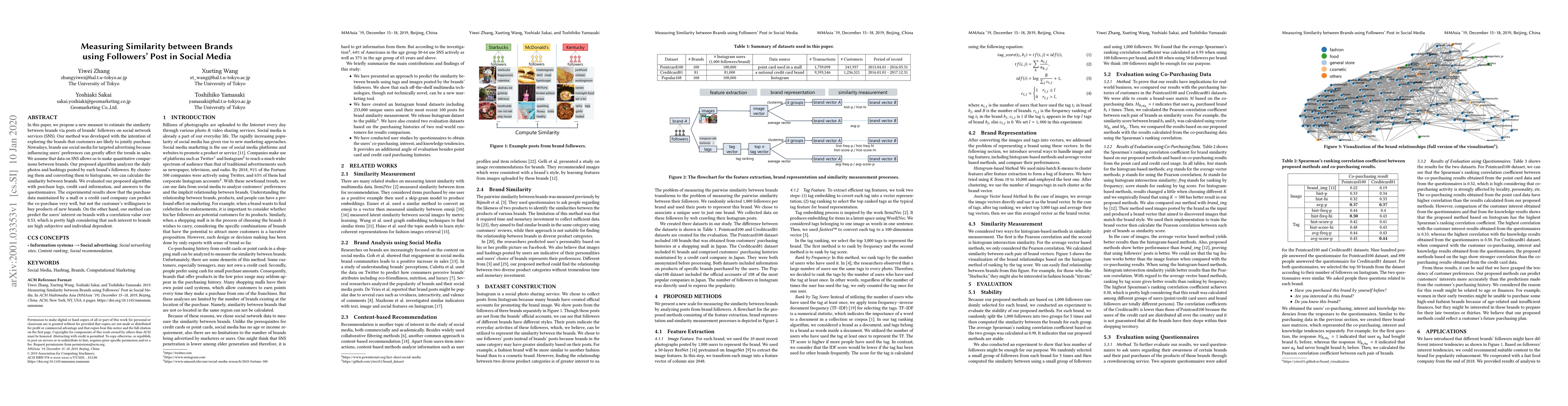 This paper introduces a novel algorithm to measure brand similarity based on the social media posts of brand followers, aiming to identify brands likely to be jointly purchased. The method clusters and analyzes daily photos and hashtags, showing high correlation in predicting users' brand interests, though it has limited predictive power for new brand purchases.