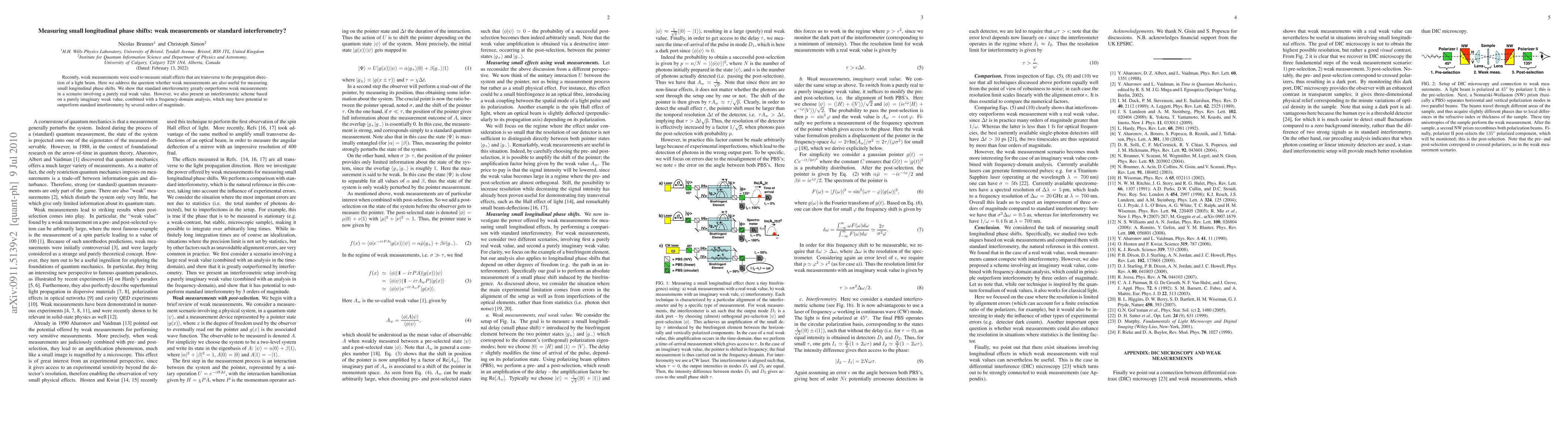 This paper compares weak measurements and standard interferometry for detecting small longitudinal phase shifts. It finds that standard interferometry is superior for real weak values but proposes an interferometric scheme using imaginary weak values and frequency-domain analysis that could outperform standard interferometry significantly.