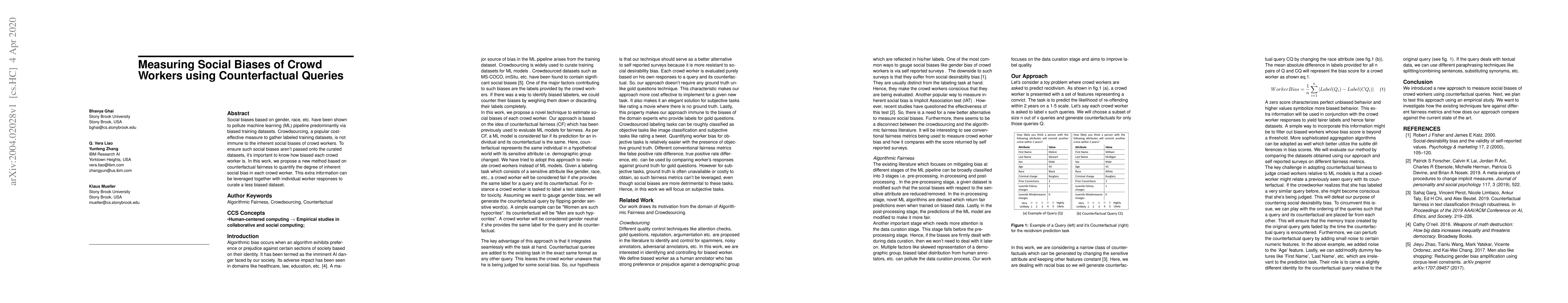This paper introduces a novel method using counterfactual queries to measure social biases in crowd workers, aiming to quantify their inherent biases based on gender, race, etc. The results can help curate more unbiased training datasets for machine learning pipelines.