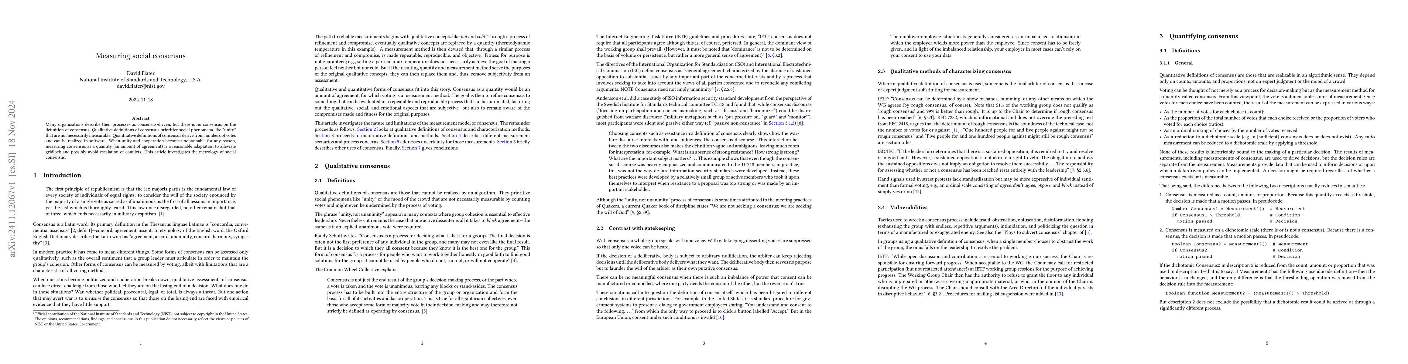This paper explores the measurement of social consensus, contrasting qualitative notions of unity with quantitative vote-based metrics, and proposes that quantitative measures can help alleviate gridlock when achieving consensus becomes unfeasible.