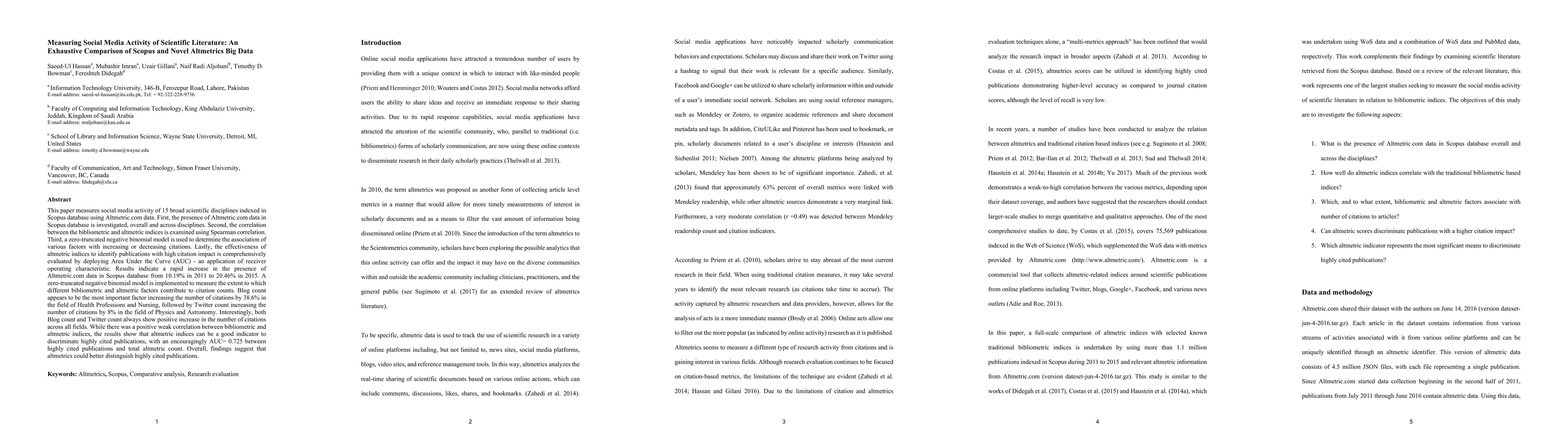 This paper measures social media activity of 15 broad scientific disciplines indexed in Scopus database using Altmetric.com data. First, the presence of Altmetric.com data in Scopus database is investigated, overall and across disciplines. Second, the correlation between the bibliometric and altmetric indices is examined using Spearman correlation. Third, a zero-truncated negative binomial model is used to determine the association of various factors with increasing or decreasing citations. Lastly, the effectiveness of altmetric indices to identify publications with high citation impact is comprehensively evaluated by deploying Area Under the Curve (AUC) - an application of receiver operating characteristic. Results indicate a rapid increase in the presence of Altmetric.com data in Scopus database from 10.19% in 2011 to 20.46% in 2015. A zero-truncated negative binomial model is implemented to measure the extent to which different bibliometric and altmetric factors contribute to citation counts. Blog count appears to be the most important factor increasing the number of citations by 38.6% in the field of Health Professions and Nursing, followed by Twitter count increasing the number of citations by 8% in the field of Physics and Astronomy. Interestingly, both Blog count and Twitter count always show positive increase in the number of citations across all fields. While there was a positive weak correlation between bibliometric and altmetric indices, the results show that altmetric indices can be a good indicator to discriminate highly cited publications, with an encouragingly AUC= 0.725 between highly cited publications and total altmetric count. Overall, findings suggest that altmetrics could better distinguish highly cited publications.