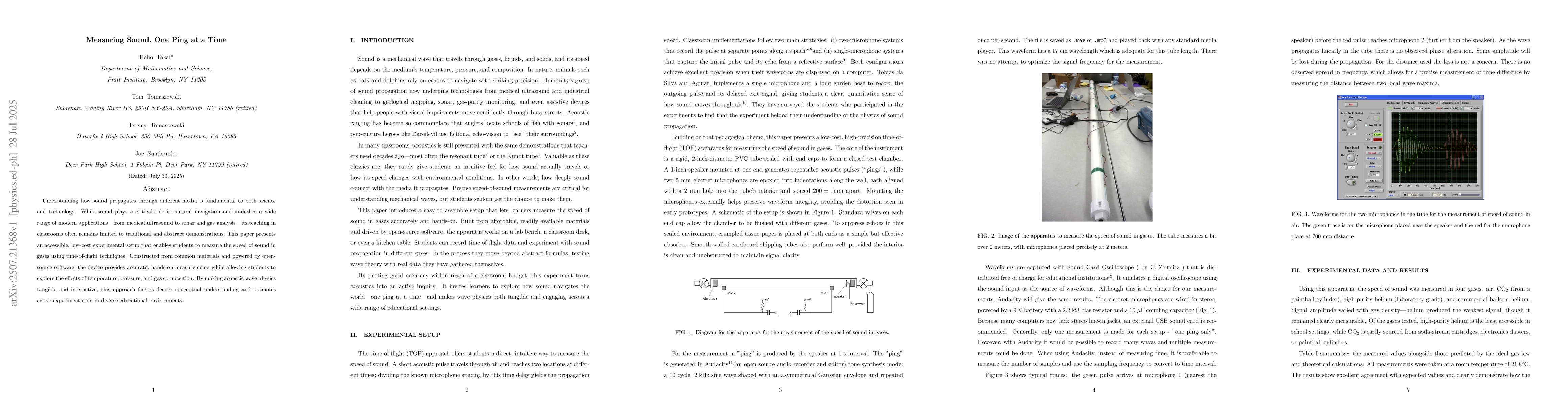 Understanding how sound propagates through different media is fundamental to both science and technology. While sound plays a critical role in natural navigation and underlies a wide range of applications - from medical ultrasound to sonar and gas analysis - its teaching in classrooms often remains limited to traditional and abstract demonstrations. This paper presents an accessible, low-cost experimental setup that enables students to measure the speed of sound in gases using time-of-flight techniques. Constructed from common materials and powered by open-source software, the device provides accurate, hands-on measurements while allowing students to explore the effects of temperature, pressure, and gas composition. By making acoustic wave physics tangible and interactive, this approach fosters deeper conceptual understanding and promotes active experimentation in diverse educational environments.