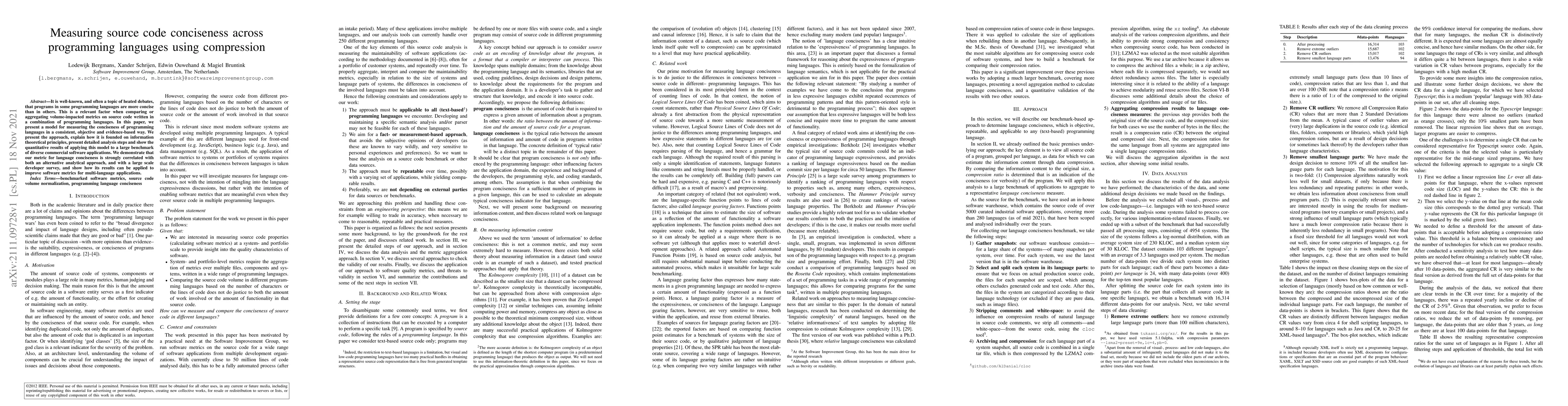 This paper proposes a model to objectively measure the conciseness of source code across different programming languages using compression techniques grounded in information theory. The authors demonstrate the model's correlation with alternative analytical methods and developer surveys, showing its potential to enhance software metrics for multi-language applications.