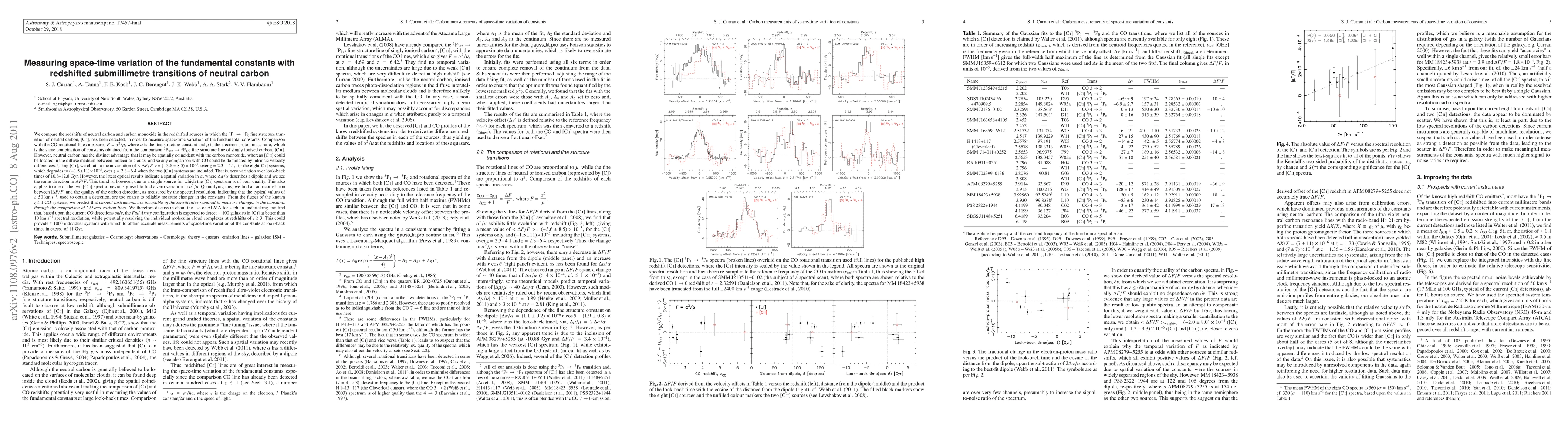 We compare the redshifts of neutral carbon and carbon monoxide in the redshifted sources in which the fine structure transition of neutral carbon, [CI], has been detected, in order to measure space-time variation of the fundamental constants. Comparison with the CO rotational lines measures gives the same combination of constants obtained from the comparison fine structure line of singly ionised carbon, [CII]. However, neutral carbon has the distinct advantage that it may be spatially coincident with the carbon monoxide, whereas [CII] could be located in the diffuse medium between molecular clouds, and so any comparison with CO could be dominated by intrinsic velocity differences. Using [CI], we obtain a mean variation of dF/F = (-3.6 +/- 8.5) x 10^-5, over z = 2.3 - 4.1, for the eight [CI] systems, which degrades to (-1.5+/- 11) x 10^-5, over z = 2.3 - 6.4 when the two [CII] systems are included. That is, zero variation over look-back times of 10.8-12.8 Gyr. However, the latest optical results indicate a spatial variation in alpha, which describes a dipole and we see the same direction in dF/F. This trend is, however, due to a single source for which the [CI] spectrum is of poor quality. This also applies to one of the two [CII] spectra previously used to find a zero variation in alpha^2/mu. Quantifying this, we find an anti-correlation between |dF/F| and the quality of the carbon detection, as measured by the spectral resolution, indicating that the typical values of >50 km/s, used to obtain a detection, are too coarse to reliably measure changes in the constants. From the fluxes of the known z > 1 CO systems, we predict that current instruments are incapable of the sensitivities required to measure changes in the constants through the comparison of CO and carbon lines. We therefore discuss in detail the use of ALMA for such an undertaking ... ABRIDGED