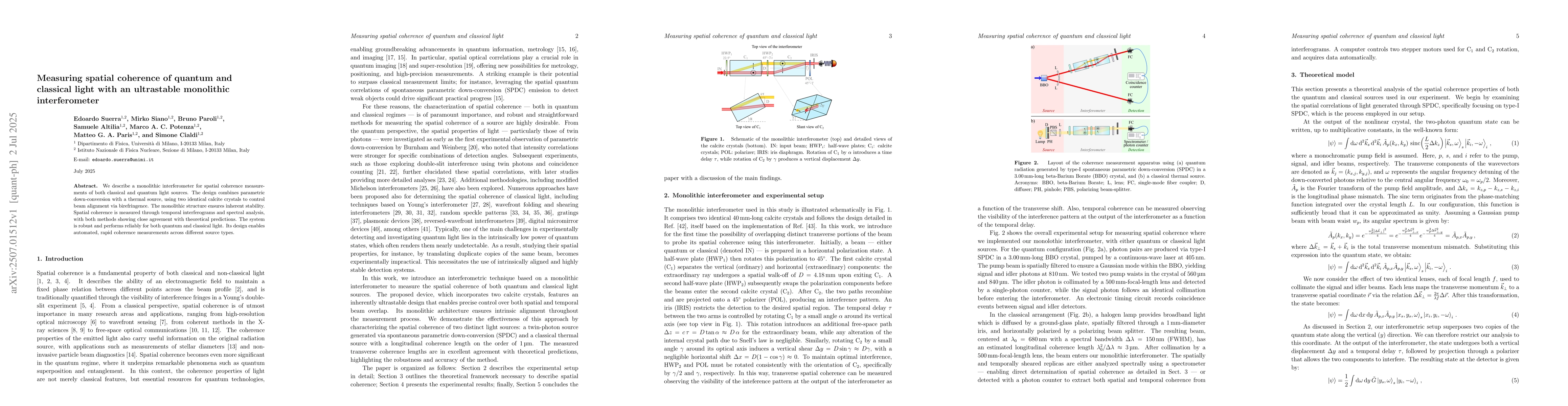 We describe a monolithic interferometer for spatial coherence measurements of both classical and quantum light sources. The design combines parametric down-conversion with a thermal source, using two identical calcite crystals to control beam alignment via birefringence. The monolithic structure ensures inherent stability. Spatial coherence is measured through temporal interferograms and spectral analysis, with both methods showing close agreement with theoretical predictions. The system is robust and performs reliably for both quantum and classical light. Its design enables automated, rapid coherence measurements across different source types.