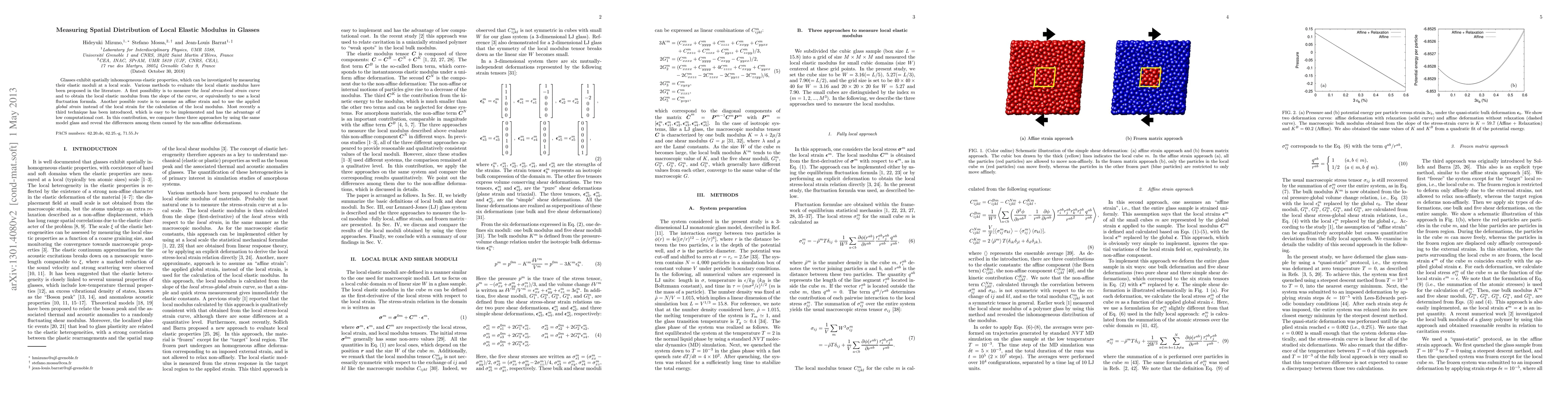 This paper compares three methods for measuring the local elastic modulus in glasses, highlighting their differences due to non-affine deformations. The methods include local stress-strain curve analysis, global strain assumption, and a recently introduced low-cost technique.