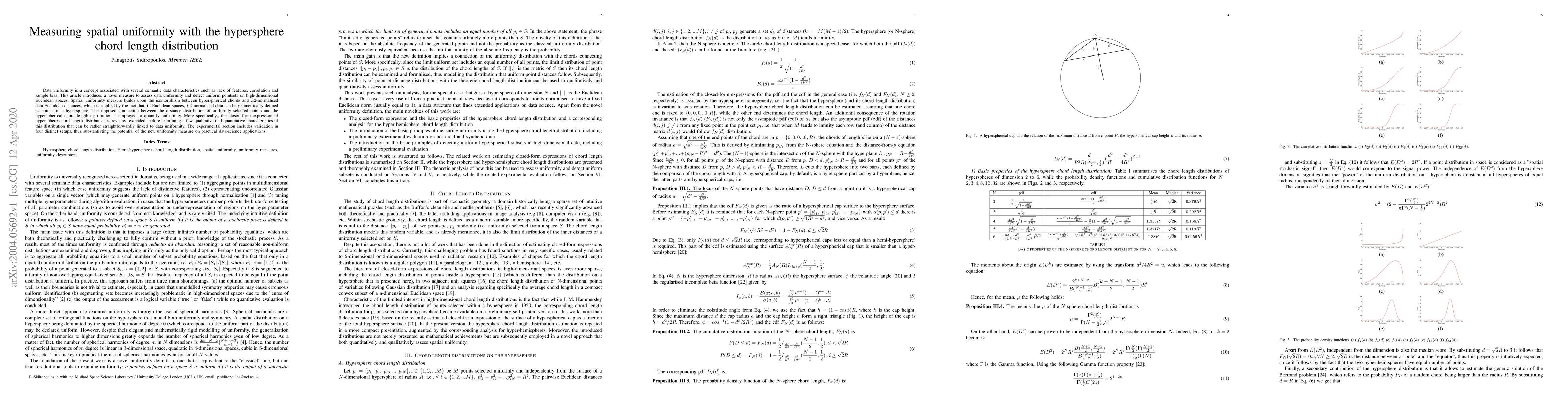 Data uniformity is a concept associated with several semantic data characteristics such as lack of features, correlation and sample bias. This article introduces a novel measure to assess data uniformity and detect uniform pointsets on high-dimensional Euclidean spaces. Spatial uniformity measure builds upon the isomorphism between hyperspherical chords and L2-normalised data Euclidean distances, which is implied by the fact that, in Euclidean spaces, L2-normalised data can be geometrically defined as points on a hypersphere. The imposed connection between the distance distribution of uniformly selected points and the hyperspherical chord length distribution is employed to quantify uniformity. More specifically,, the closed-form expression of hypersphere chord length distribution is revisited extended, before examining a few qualitative and quantitative characteristics of this distribution that can be rather straightforwardly linked to data uniformity. The experimental section includes validation in four distinct setups, thus substantiating the potential of the new uniformity measure on practical data-science applications.