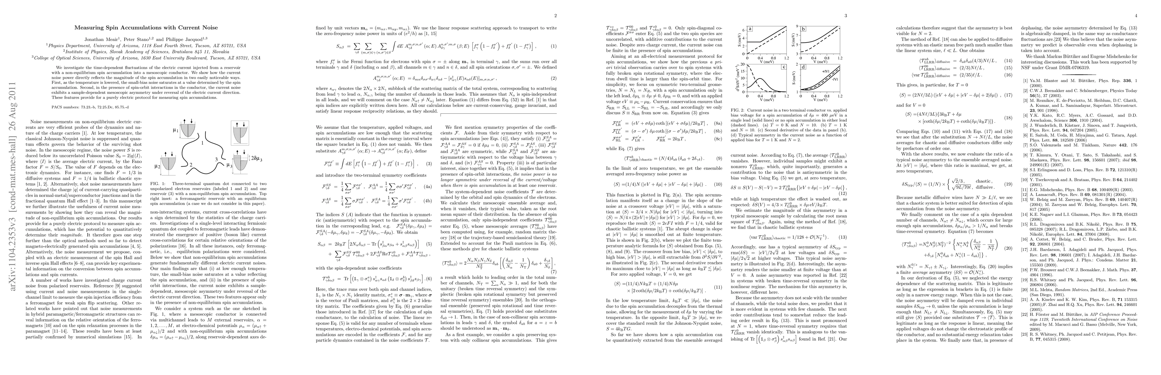 This paper explores how fluctuations in electric current injected into a mesoscopic conductor with non-equilibrium spin accumulation can be used to measure spin accumulations. The current noise power reveals spin accumulation through saturation at low temperatures and mesoscopic asymmetry under current direction reversal due to spin-orbit interactions.