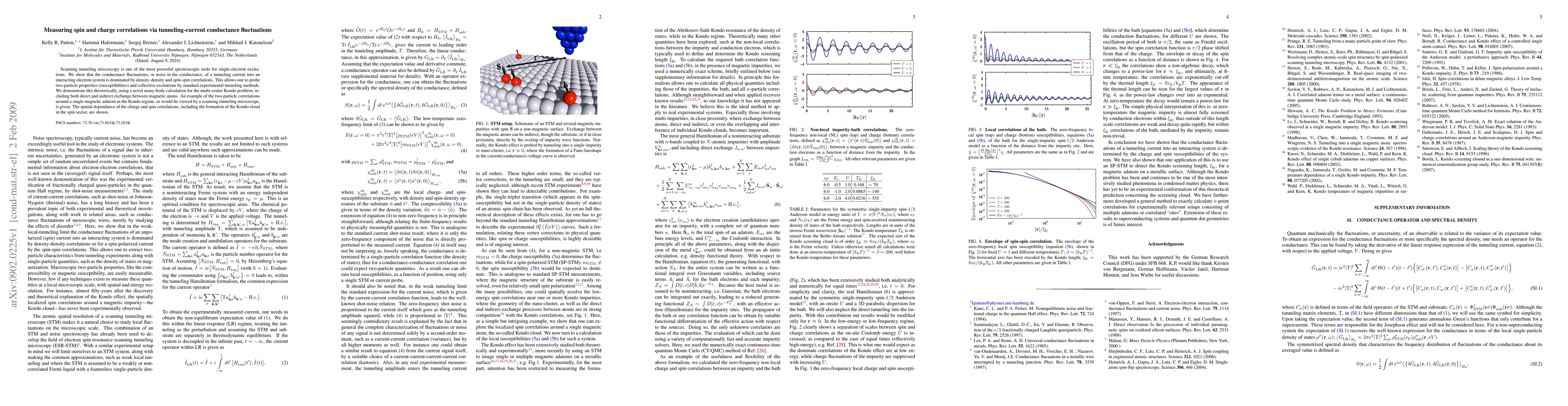 This paper demonstrates that tunneling-current conductance fluctuations reveal density-density and spin-spin correlations in interacting electron systems, enabling the probing of two-particle properties and collective excitations via standard tunneling methods. Theoretical calculations for the multi-center Kondo problem illustrate these correlations, showing the spatial dependence of charge and spin correlations, including the Kondo cloud formation around a magnetic adatom.
