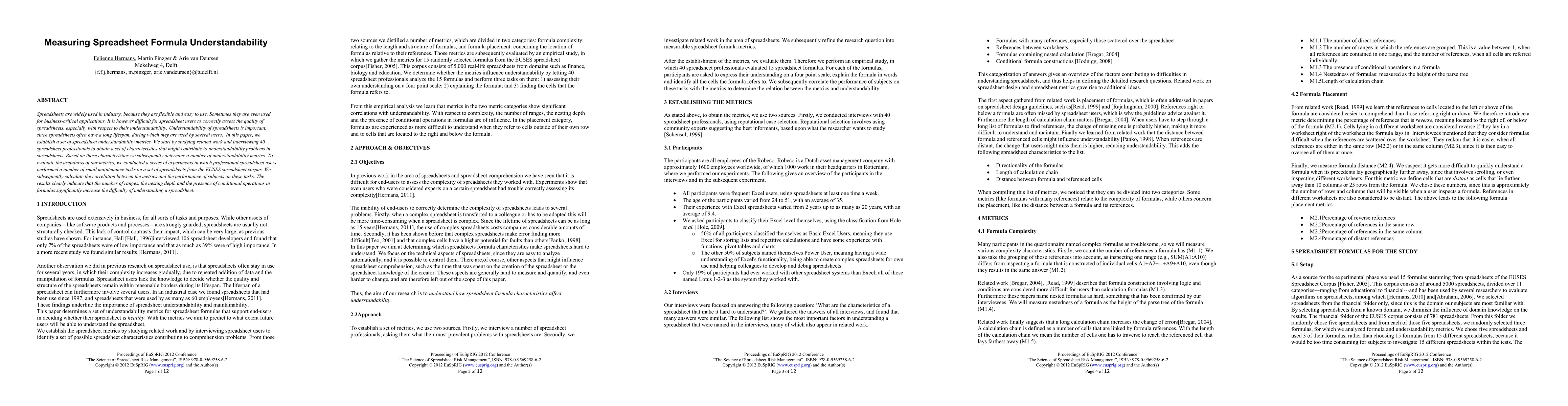 This paper develops metrics to measure spreadsheet formula understandability, identifying characteristics from interviews with professionals that contribute to comprehension issues. Experiments show that metrics like range count, nesting depth, and conditional operations correlate strongly with users' performance in maintenance tasks.