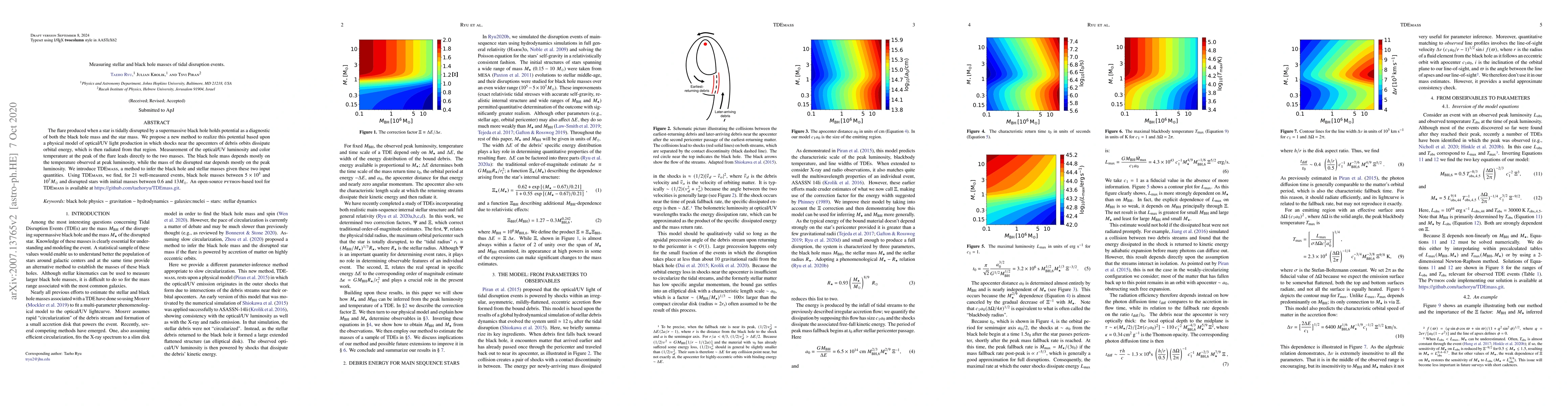 A new method called TDEmass is proposed to measure stellar and black hole masses of tidal disruption events by analyzing optical/UV light production, yielding black hole masses between $5 imes 10^5$ and $10^7 M_igodot$ and star masses between 0.6 and $13M_igodot$.