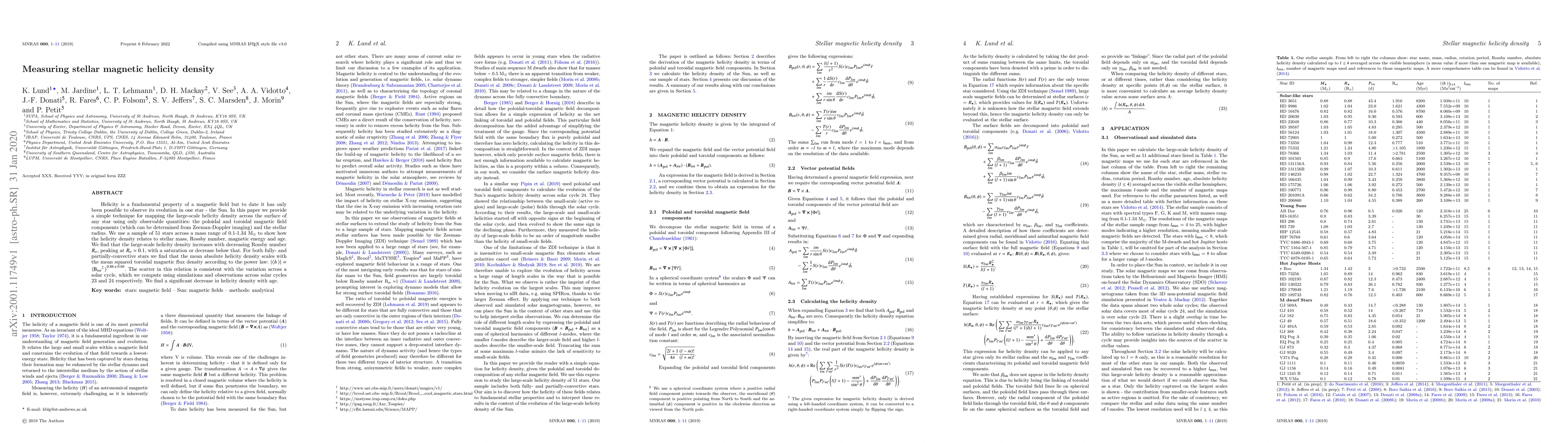 Helicity is a fundamental property of a magnetic field but to date it has only been possible to observe its evolution in one star - the Sun. In this paper we provide a simple technique for mapping the large-scale helicity density across the surface of any star using only observable quantities: the poloidal and toroidal magnetic field components (which can be determined from Zeeman-Doppler imaging) and the stellar radius. We use a sample of 51 stars across a mass range of 0.1-1.34 M$_\odot$ to show how the helicity density relates to stellar mass, Rossby number, magnetic energy and age. We find that the large-scale helicity density increases with decreasing Rossby number $R_o$, peaking at $R_o \simeq 0.1$, with a saturation or decrease below that. For both fully- and partially-convective stars we find that the mean absolute helicity density scales with the mean squared toroidal magnetic flux density according to the power law: $|\langle{h\,}\rangle|$ $\propto$ $\langle{\rm{B_{tor}}^2_{}\,\rangle}^{0.86\,\pm\,0.04}$. The scatter in this relation is consistent with the variation across a solar cycle, which we compute using simulations and observations across solar cycles 23 and 24 respectively. We find a significant decrease in helicity density with age.