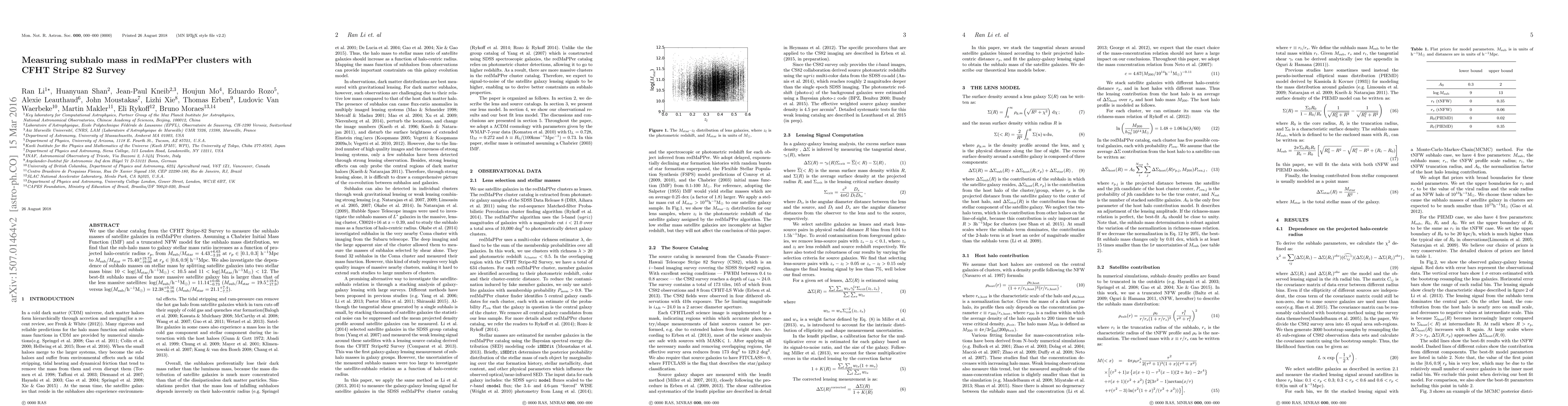 We use the shear catalog from the CFHT Stripe-82 Survey to measure the subhalo masses of satellite galaxies in redMaPPer clusters. Assuming a Chabrier Initial Mass Function (IMF) and a truncated NFW model for the subhalo mass distribution, we find that the sub-halo mass to galaxy stellar mass ratio increases as a function of projected halo-centric radius $r_p$, from $M_{\rm sub}/M_{\rm star}=4.43^{+ 6.63}_{- 2.23}$ at $r_p \in [0.1,0.3]$ $h^{-1}Mpc$ to $M_{\rm sub}/M_{\rm star}=75.40^{+ 19.73}_{- 19.09}$ at $r_p \in [0.6,0.9]$ $h^{-1}Mpc$. We also investigate the dependence of subhalo masses on stellar mass by splitting satellite galaxies into two stellar mass bins: $10<\log(M_{\rm star}/M_{\rm sun})<10.5$ and $11<\log(M_{\rm star}/M_{\rm sun})<12$. The best-fit subhalo mass of the more massive satellite galaxy bin is larger than that of the less massive satellites: $\log(M_{\rm sub}/M_{\rm sun})=11.14 ^{+ 0.66 }_{- 0.73}$ ($M_{\rm sub}/M_{\rm star}=19.5^{+19.8}_{-17.9}$) versus $\log(M_{\rm sub}/M_{\rm sun})=12.38 ^{+ 0.16 }_{- 0.16}$ ($M_{\rm sub}/M_{\rm star}=21.1^{+7.4}_{-7.7}$).