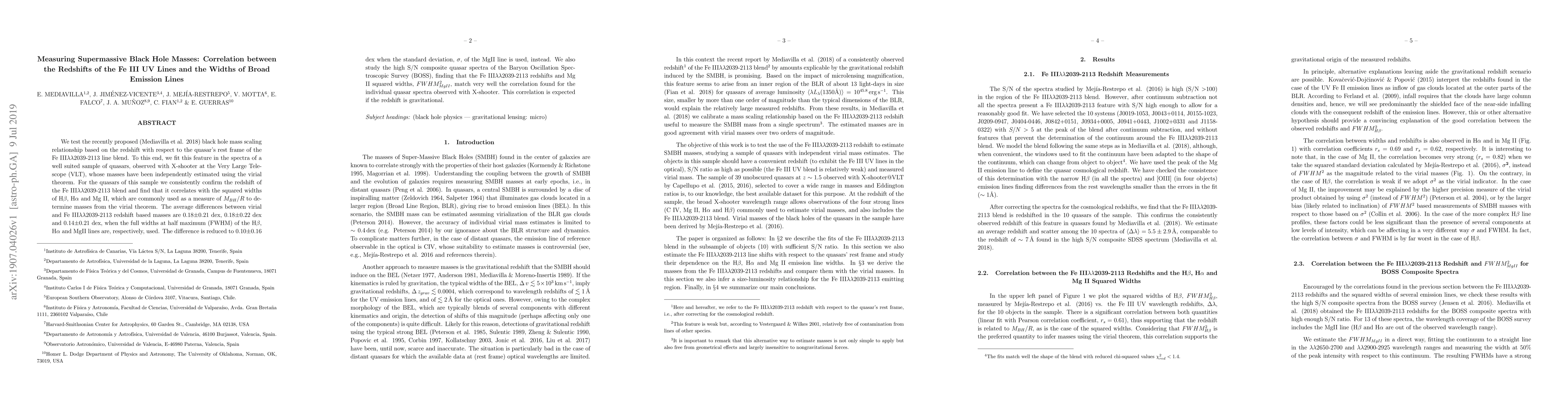 We test the recently proposed (Mediavilla et al. 2018) black hole mass scaling relationship based on the redshift {with respect to the quasar's rest frame} of the Fe III$\lambda\lambda$2039-2113 line blend. To this end, we fit this feature in the spectra of a well suited sample of quasars, observed with X-shooter at the Very Large Telescope (VLT), whose masses have been independently estimated using the virial theorem. For the quasars of this sample we consistently confirm the redshift of the Fe III$\lambda\lambda$2039-2113 blend and find that it correlates with the squared widths of H$\beta$, H$\alpha$ and Mg II, which are commonly used as a measure of $M_{BH}/R$ to determine masses from the virial theorem. The average differences between virial and Fe III$\lambda\lambda$2039-2113 redshift based masses are 0.18$\pm 0.21$ dex, 0.18$\pm 0.22$ dex and 0.14$\pm 0.21$ dex, when the full widths at half maximum (FWHM) of the H$\beta$, H$\alpha$ and MgII lines are, respectively, used. The difference is reduced to 0.10$\pm 0.16$ dex when the standard deviation, $\sigma$, of {the} MgII line is used, instead. We also study the high S/N composite quasar spectra of the Baryon Oscillation Spectroscopic Survey (BOSS), finding that the Fe III$\lambda\lambda$2039-2113 redshifts and Mg II squared widths, $FWHM_{MgII}^2$, match very well the correlation found for the individual quasar spectra observed with X-shooter. This correlation is expected if the redshift is gravitational.