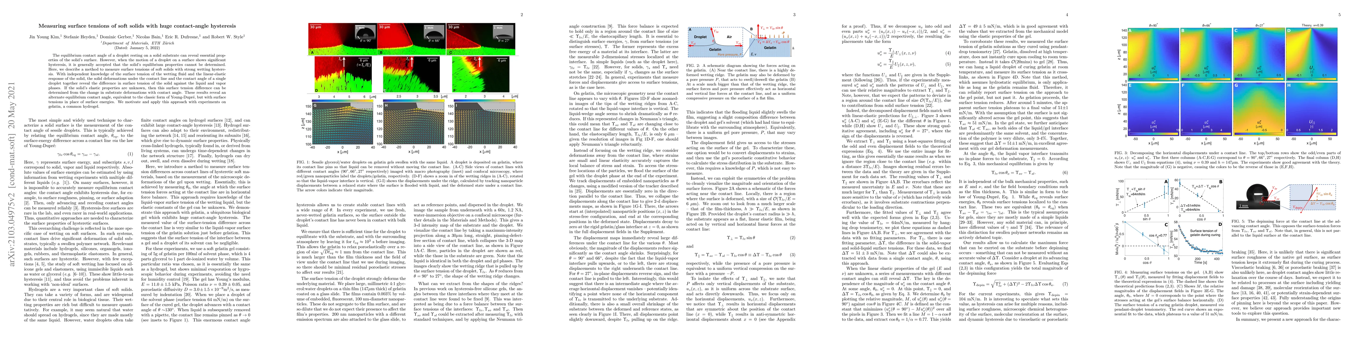 This paper presents a method to measure surface tensions of soft solids exhibiting large contact-angle hysteresis by analyzing the deformations of the solid under droplet contact and the resulting contact angle. It reveals an alternate equilibrium contact angle based on surface tensions instead of surface energies, demonstrated experimentally on gelatin hydrogels.