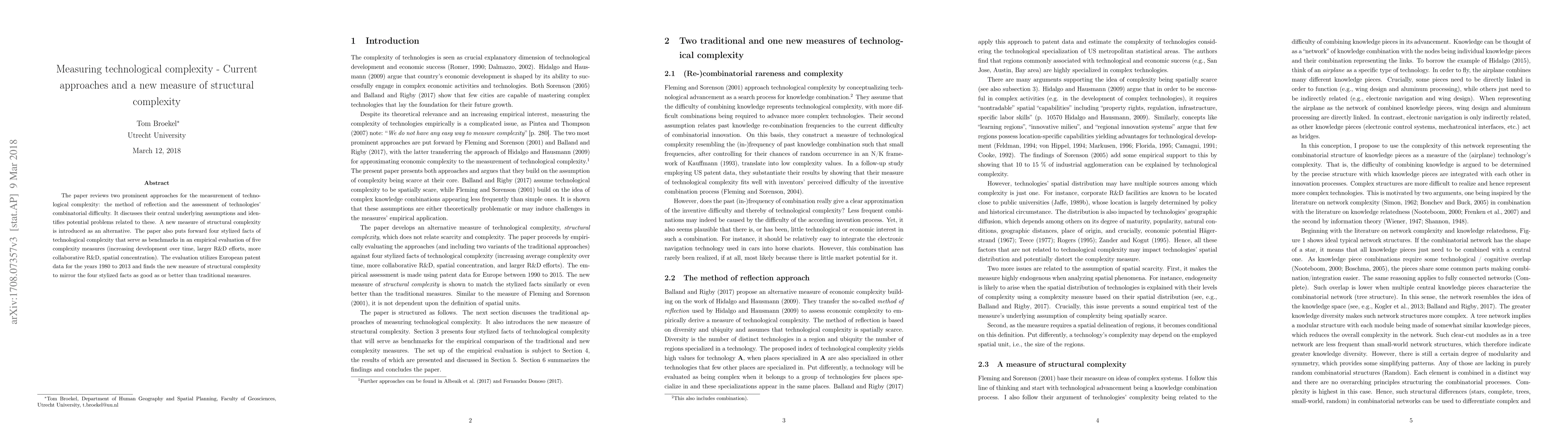 The paper reviews two prominent approaches for the measurement of technological complexity: the method of reflection and the assessment of technologies' combinatorial difficulty. It discusses their central underlying assumptions and identifies potential problems related to these. A new measure of structural complexity is introduced as an alternative. The paper also puts forward four stylized facts of technological complexity that serve as benchmarks in an empirical evaluation of five complexity measures (increasing development over time, larger R&D efforts, more collaborative R&D, spatial concentration). The evaluation utilizes European patent data for the years 1980 to 2013 and finds the new measure of structural complexity to mirror the four stylized facts as good as or better than traditional measures.