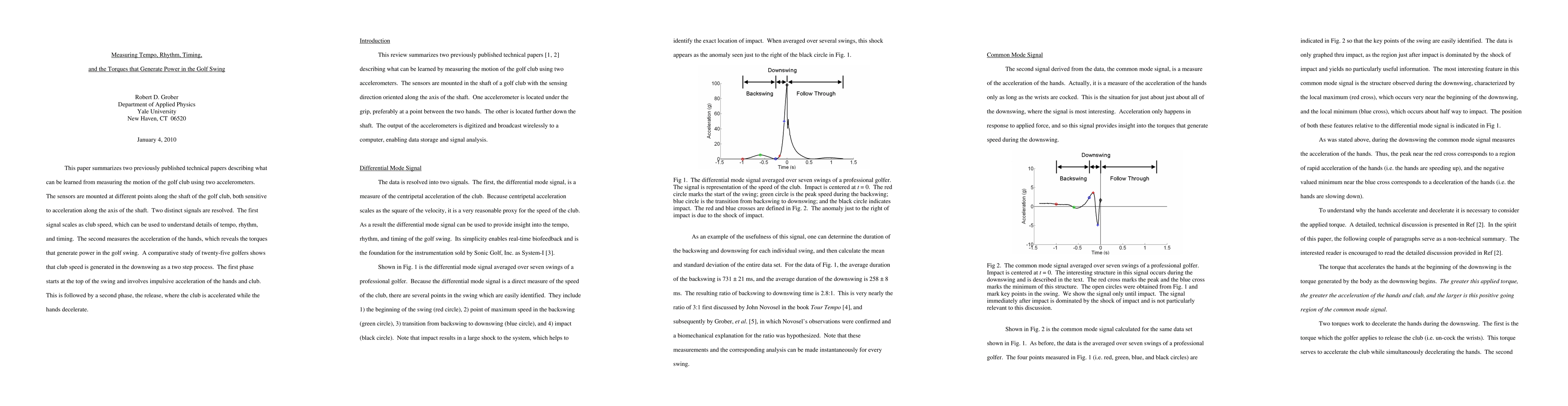 This paper summarizes two previously published technical papers describing what can be learned from measuring the motion of the golf club using two accelerometers. The sensors are mounted at different points along the shaft of the golf club, both sensitive to acceleration along the axis of the shaft. Two distinct signals are resolved. The first signal scales as club speed, which can be used to understand details of tempo, rhythm, and timing. The second measures the acceleration of the hands, which reveals the torques that generate power in the golf swing. A comparative study of twenty-five golfers shows that club speed is generated in the downswing as a two step process. The first phase starts at the top of the swing and involves impulsive acceleration of the hands and club. This is followed by a second phase, the release, where the club is accelerated while the hands decelerate.