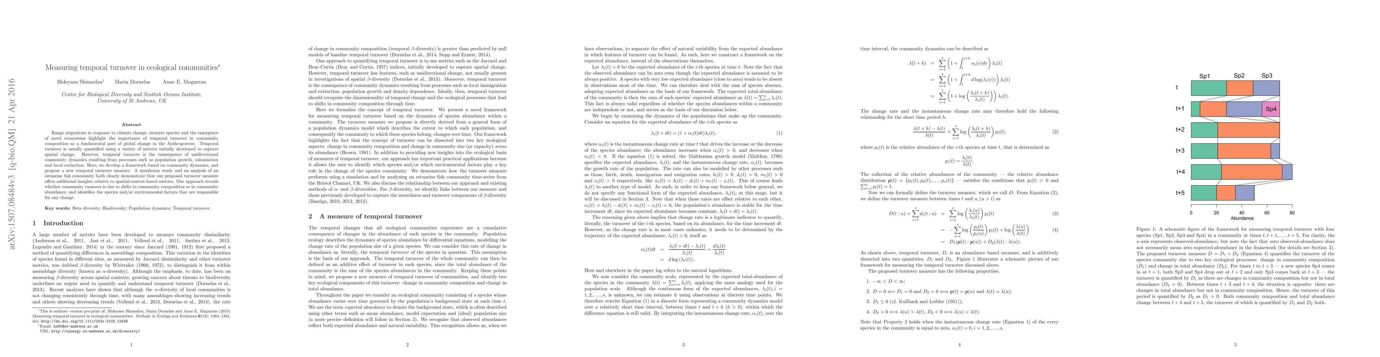 Range migrations in response to climate change, invasive species and the emergence of novel ecosystems highlight the importance of temporal turnover in community composition as a fundamental part of global change in the Anthropocene. Temporal turnover is usually quantified using a variety of metrics initially developed to capture spatial change. However, temporal turnover is the consequence of unidirectional community dynamics resulting from processes such as population growth, colonisation and local extinction. Here, we develop a framework based on community dynamics, and propose a new temporal turnover measure. A simulation study and an analysis of an estuarine fish community both clearly demonstrate that our proposed turnover measure offers additional insights relative to spatial-context-based metrics. Our approach reveals whether community turnover is due to shifts in community composition or in community abundance, and identifies the species and/or environmental factors that are responsible for any change.