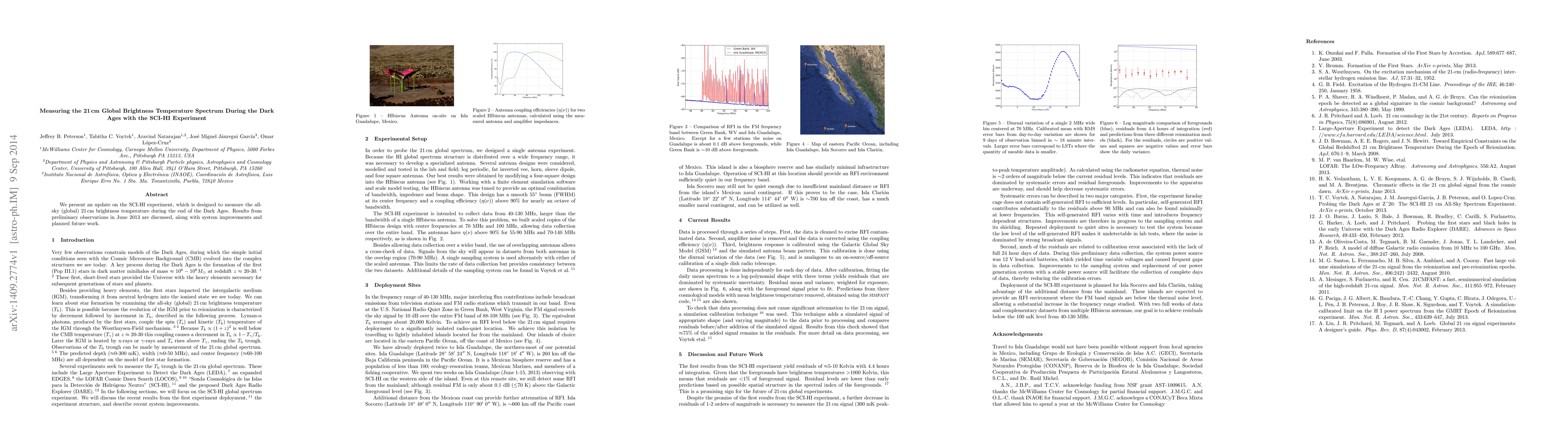 The SCI-HI experiment, aimed at measuring the global 21 cm brightness temperature during the Dark Ages, shared preliminary 2013 observations and outlined system enhancements and future plans.