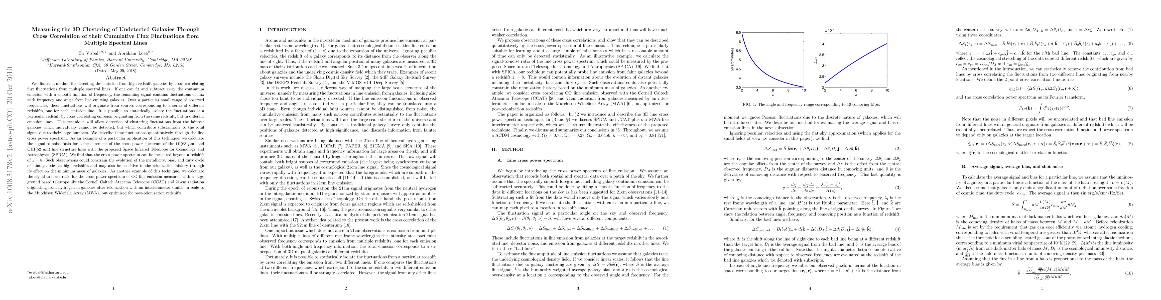 We discuss a method for detecting the emission from high redshift galaxies by cross correlating flux fluctuations from multiple spectral lines. If one can fit and subtract away the continuum emission with a smooth function of frequency, the remaining signal contains fluctuations of flux with frequency and angle from line emitting galaxies. Over a particular small range of observed frequencies, these fluctuations will originate from sources corresponding to a series of different redshifts, one for each emission line. It is possible to statistically isolate the fluctuations at a particular redshift by cross correlating emission originating from the same redshift, but in different emission lines. This technique will allow detection of clustering fluctuations from the faintest galaxies which individually cannot be detected, but which contribute substantially to the total signal due to their large numbers. We describe these fluctuations quantitatively through the line cross power spectrum. As an example of a particular application of this technique, we calculate the signal-to-noise ratio for a measurement of the cross power spectrum of the OI(63 micron) and OIII(52 micron) fine structure lines with the proposed Space Infrared Telescope for Cosmology and Astrophysics. We find that the cross power spectrum can be measured beyond a redshift of z=8. Such observations could constrain the evolution of the metallicity, bias, and duty cycle of faint galaxies at high redshifts and may also be sensitive to the reionization history through its effect on the minimum mass of galaxies. As another example, we consider the cross power spectrum of CO line emission measured with a large ground based telescope like CCAT and 21-cm radiation originating from hydrogen in galaxies after reionization with an interferometer similar in scale to MWA, but optimized for post-reionization redshifts.