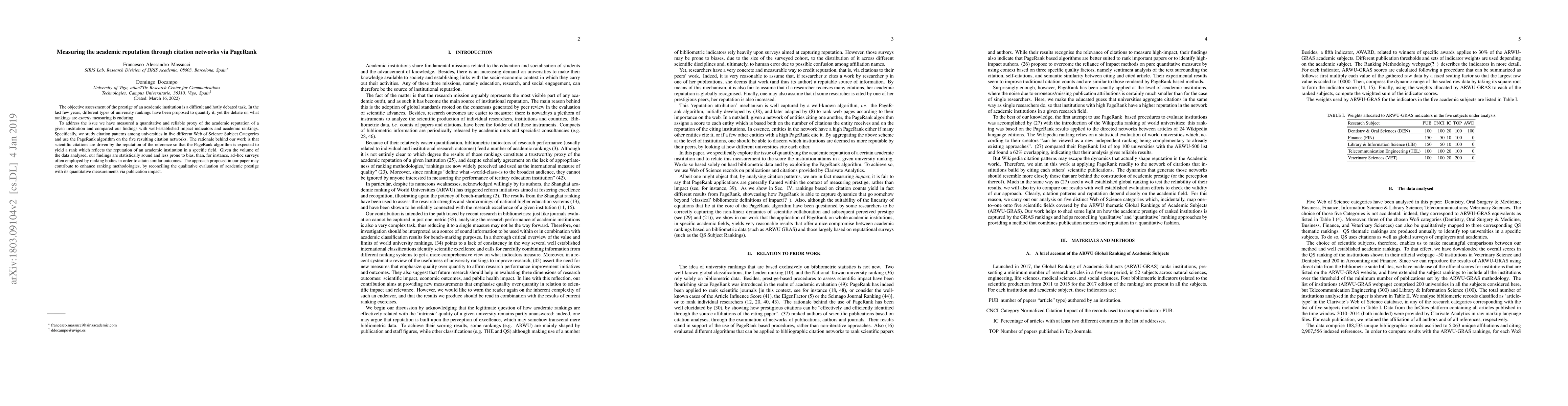 Researchers developed a method to measure academic reputation through citation networks using PageRank algorithm, correlating well with existing university rankings, providing a quantitative assessment of institution prestige based on publication impact.