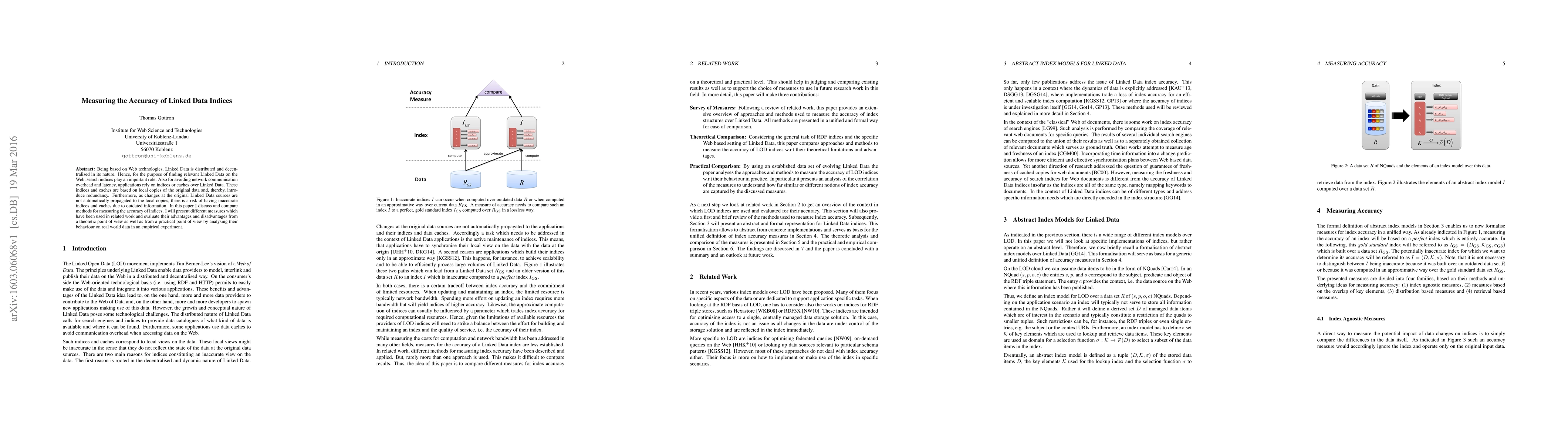 Being based on Web technologies, Linked Data is distributed and decentralised in its nature. Hence, for the purpose of finding relevant Linked Data on the Web, search indices play an important role. Also for avoiding network communication overhead and latency, applications rely on indices or caches over Linked Data. These indices and caches are based on local copies of the original data and, thereby, introduce redundancy. Furthermore, as changes at the original Linked Data sources are not automatically propagated to the local copies, there is a risk of having inaccurate indices and caches due to outdated information. In this paper I discuss and compare methods for measuring the accuracy of indices. I will present different measures which have been used in related work and evaluate their advantages and disadvantages from a theoretic point of view as well as from a practical point of view by analysing their behaviour on real world data in an empirical experiment.