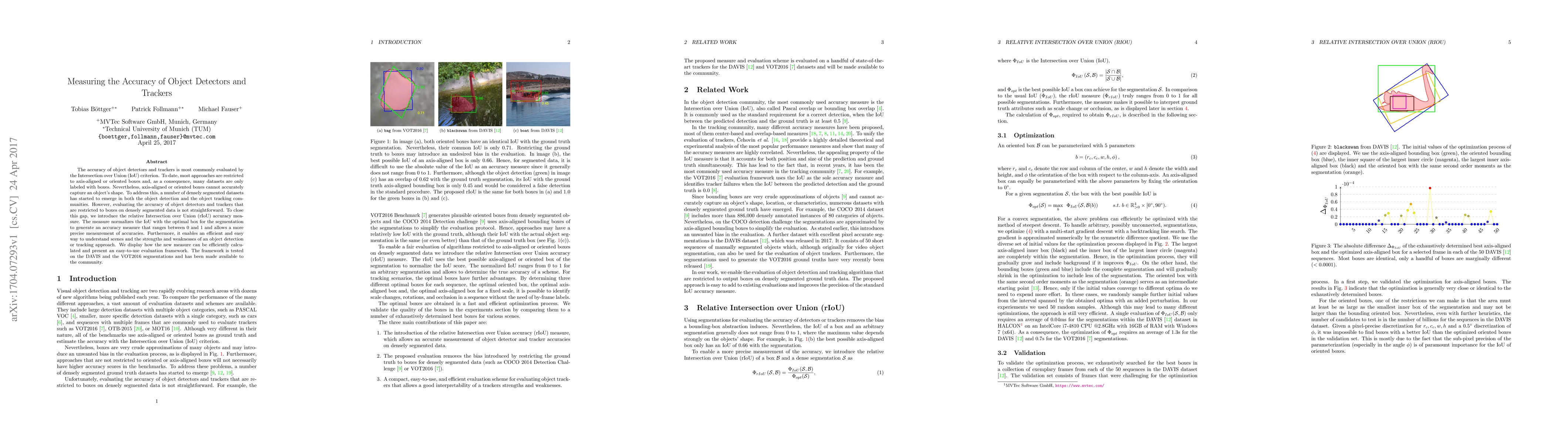 The accuracy of object detectors and trackers is most commonly evaluated by the Intersection over Union (IoU) criterion. To date, most approaches are restricted to axis-aligned or oriented boxes and, as a consequence, many datasets are only labeled with boxes. Nevertheless, axis-aligned or oriented boxes cannot accurately capture an object's shape. To address this, a number of densely segmented datasets has started to emerge in both the object detection and the object tracking communities. However, evaluating the accuracy of object detectors and trackers that are restricted to boxes on densely segmented data is not straightforward. To close this gap, we introduce the relative Intersection over Union (rIoU) accuracy measure. The measure normalizes the IoU with the optimal box for the segmentation to generate an accuracy measure that ranges between 0 and 1 and allows a more precise measurement of accuracies. Furthermore, it enables an efficient and easy way to understand scenes and the strengths and weaknesses of an object detection or tracking approach. We display how the new measure can be efficiently calculated and present an easy-to-use evaluation framework. The framework is tested on the DAVIS and the VOT2016 segmentations and has been made available to the community.
