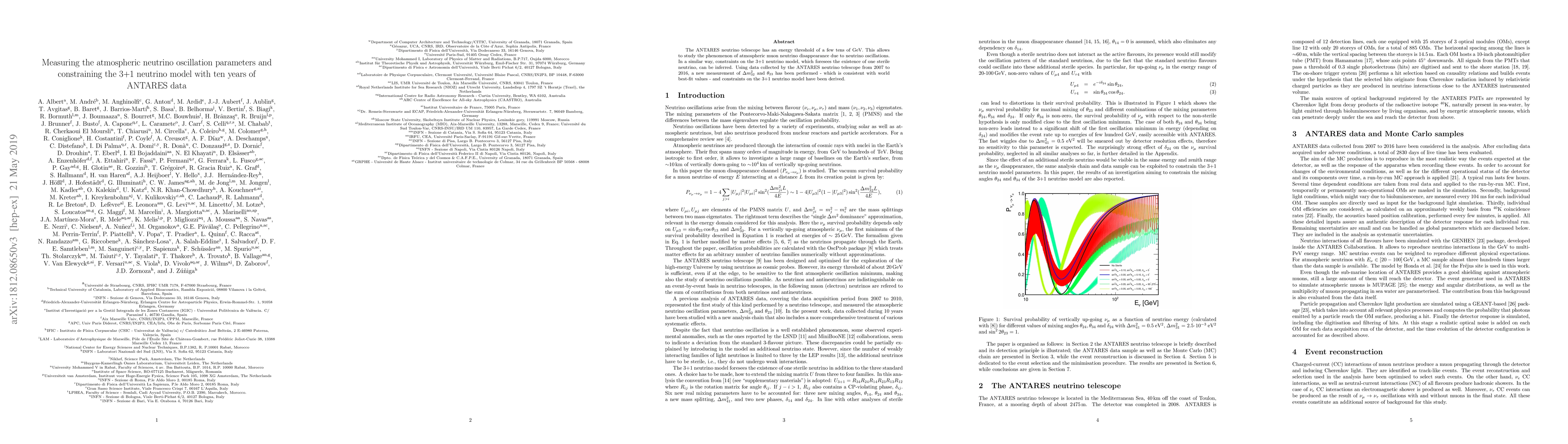 The ANTARES telescope measured atmospheric neutrino oscillation parameters over ten years, yielding results consistent with best-fit values. The study also derived constraints on the 3+1 neutrino model, including the potential existence of one sterile neutrino.