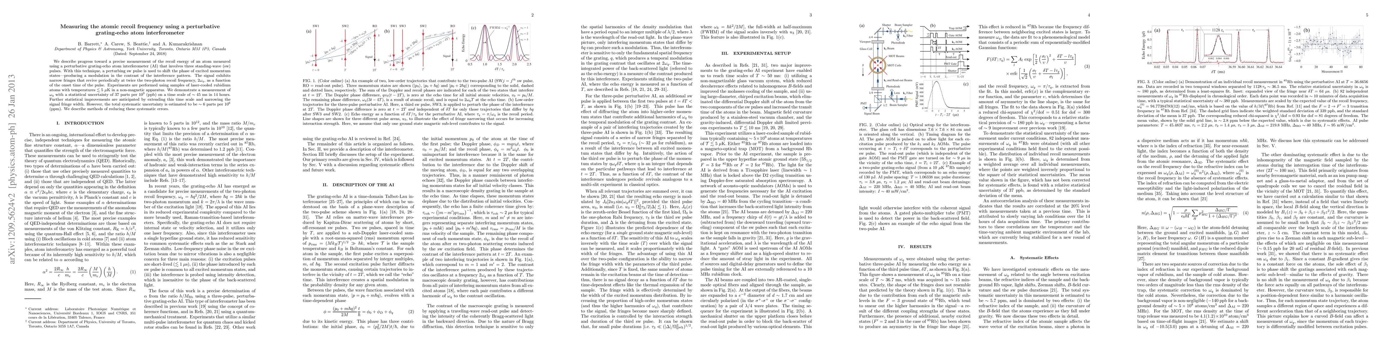 We describe progress toward a precise measurement of the recoil energy of an atom measured using a perturbative grating-echo atom interferometer (AI) that involves three standing-wave (sw) pulses. With this technique, a perturbing sw pulse is used to shift the phase of excited momentum states---producing a modulation in the contrast of the interference pattern. The signal exhibits narrow fringes that revive periodically at twice the two-photon recoil frequency, $2\omega_q$, as a function of the onset time of the pulse. Experiments are performed using samples of laser-cooled rubidium atoms with temperatures $\lesssim 5$ $\mu$K in a non-magnetic apparatus. We demonstrate a measurement of $\omega_q$ with a statistical uncertainty of 37 parts per $10^9$ (ppb) on a time scale of $\sim 45$ ms in 14 hours. Further statistical improvements are anticipated by extending this time scale and narrowing the signal fringe width. However, the total systematic uncertainty is estimated to be $\sim 6$ parts per $10^6$ (ppm). We describe methods of reducing these systematic errors.