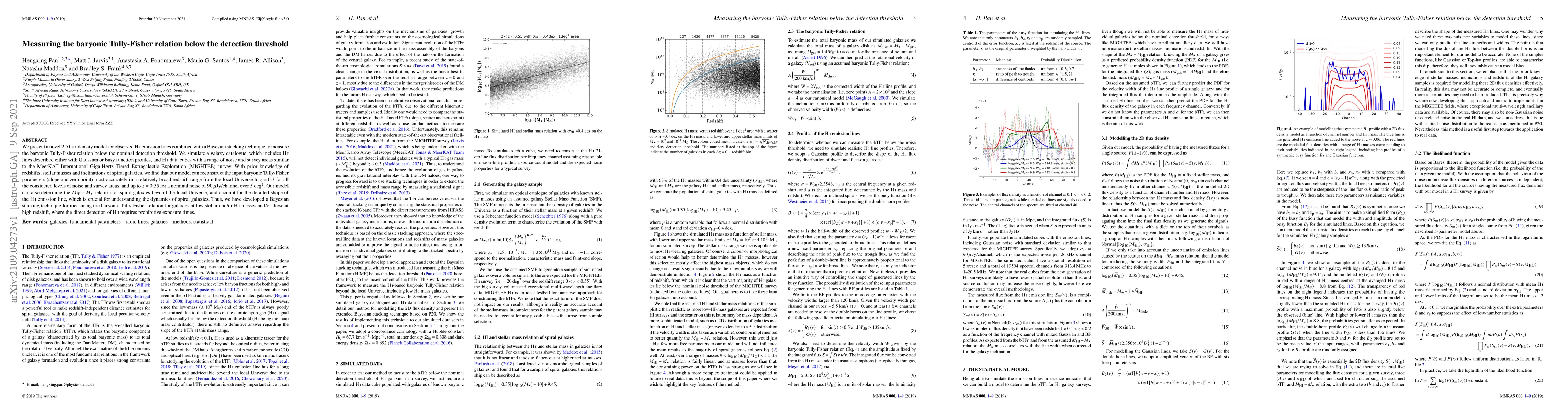 This paper introduces a 2D flux density model and Bayesian stacking technique to measure the baryonic Tully-Fisher relation for galaxies below the detection threshold. The model accurately reconstructs the baryonic Tully-Fisher parameters and the $M_{\rm HI} - M_{\star}$ relation, even for high-redshift galaxies, overcoming the limitations of direct HI detection.