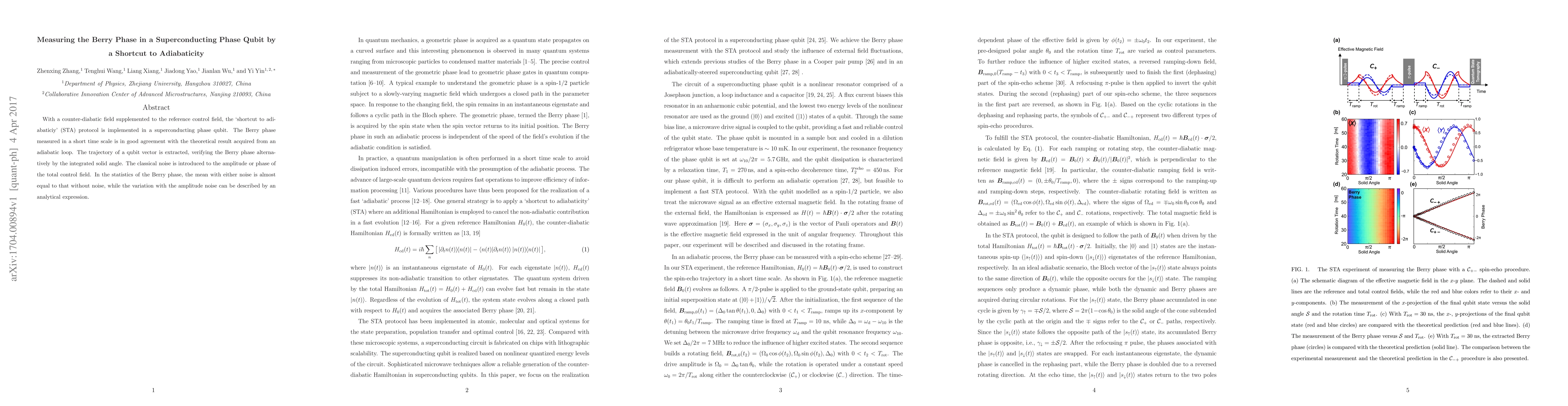 With a counter-diabatic field supplemented to the reference control field, the `shortcut to adiabaticiy' (STA) protocol is implemented in a superconducting phase qubit. The Berry phase measured in a short time scale is in good agreement with the theoretical result acquired from an adiabatic loop. The trajectory of a qubit vector is extracted, verifying the Berry phase alternatively by the integrated solid angle. The classical noise is introduced to the amplitude or phase of the total control field. In the statistics of the Berry phase, the mean with either noise is almost equal to that without noise, while the variation with the amplitude noise can be described by an analytical expression.