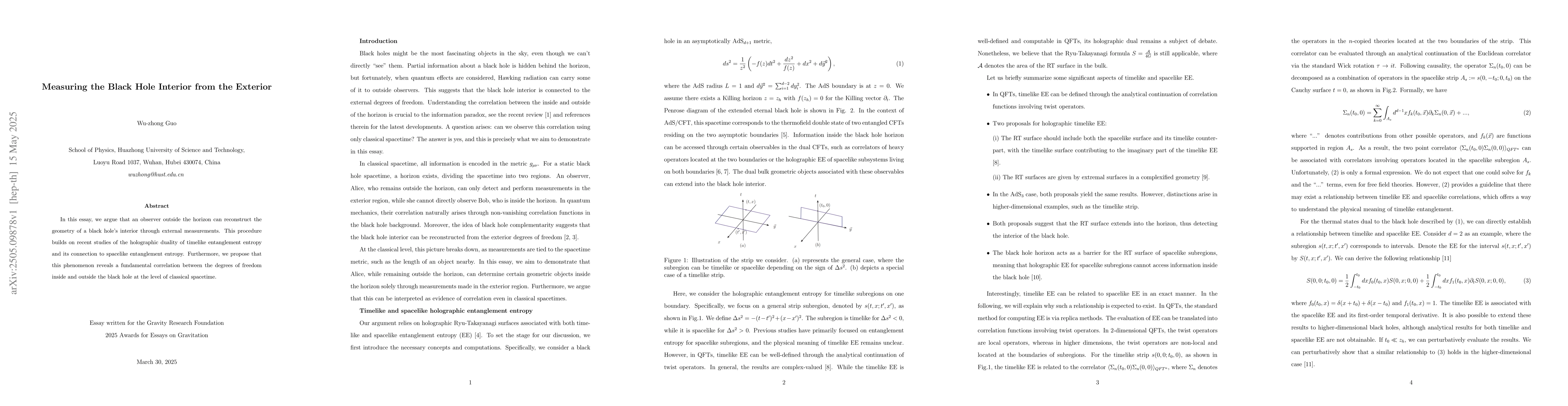 In this essay, we argue that an observer outside the horizon can reconstruct the geometry of a black hole's interior through external measurements. This procedure builds on recent studies of the holographic duality of timelike entanglement entropy and its connection to spacelike entanglement entropy. Furthermore, we propose that this phenomenon reveals a fundamental correlation between the degrees of freedom inside and outside the black hole at the level of classical spacetime.