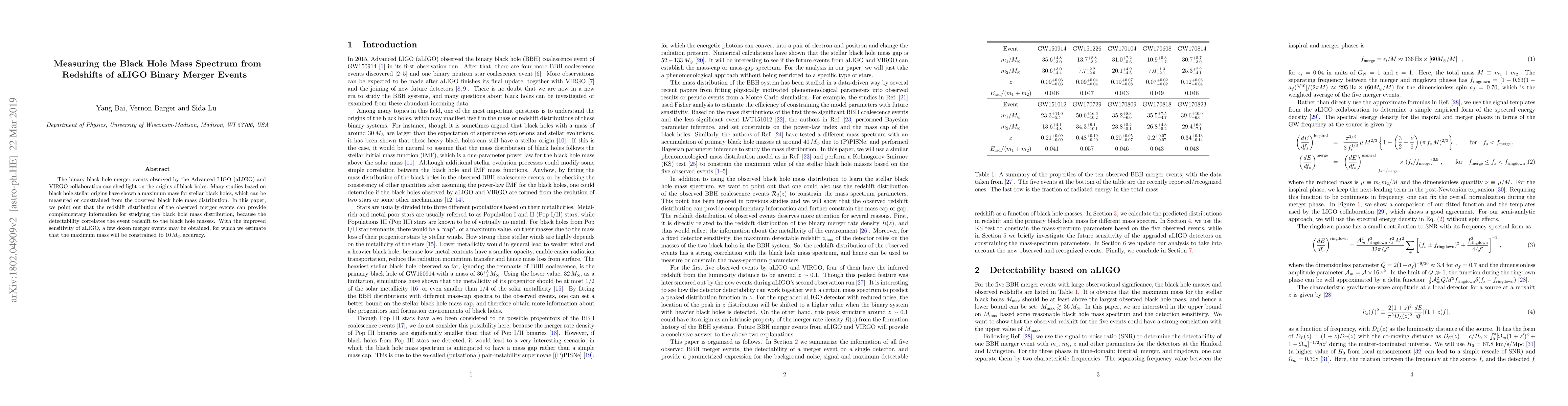 This paper investigates the black hole mass spectrum using the redshifts of binary black hole merger events detected by aLIGO. The study finds that the observed redshift distribution provides additional insights into the black hole mass distribution, constraining the maximum stellar black hole mass to below $76\,M_\odot$ at 90% confidence. Future improvements in aLIGO sensitivity are expected to refine this constraint to $10\,M_\odot$.