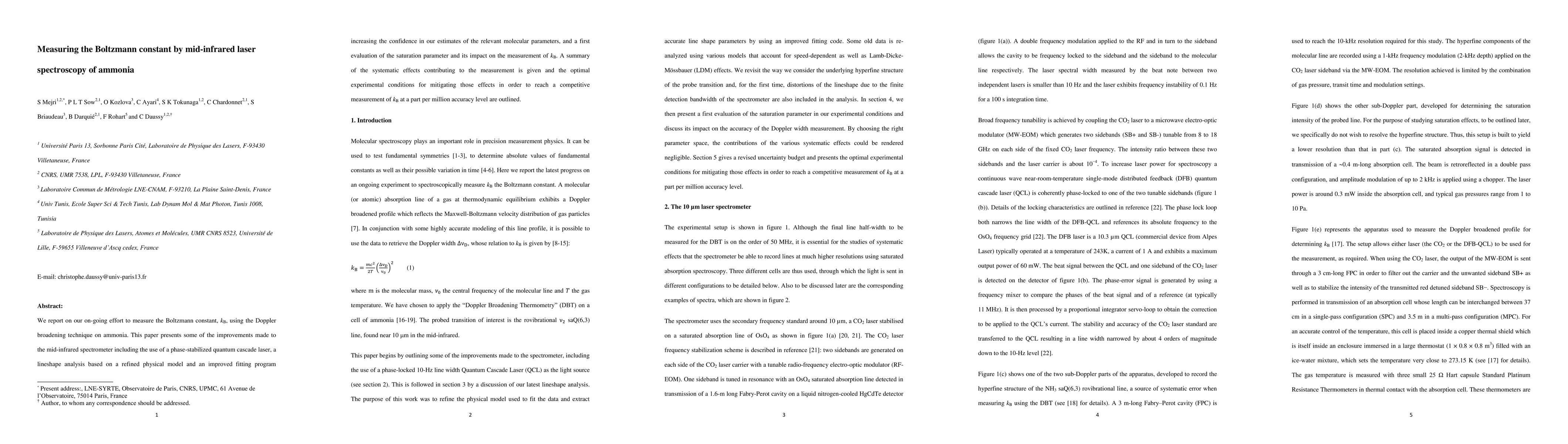 This paper details advancements in measuring the Boltzmann constant $k_B$ via mid-infrared laser spectroscopy of ammonia, including improvements to the spectrometer and analysis techniques, and outlines strategies to achieve a part per million accuracy level. Systematic effects and their mitigation are also discussed.