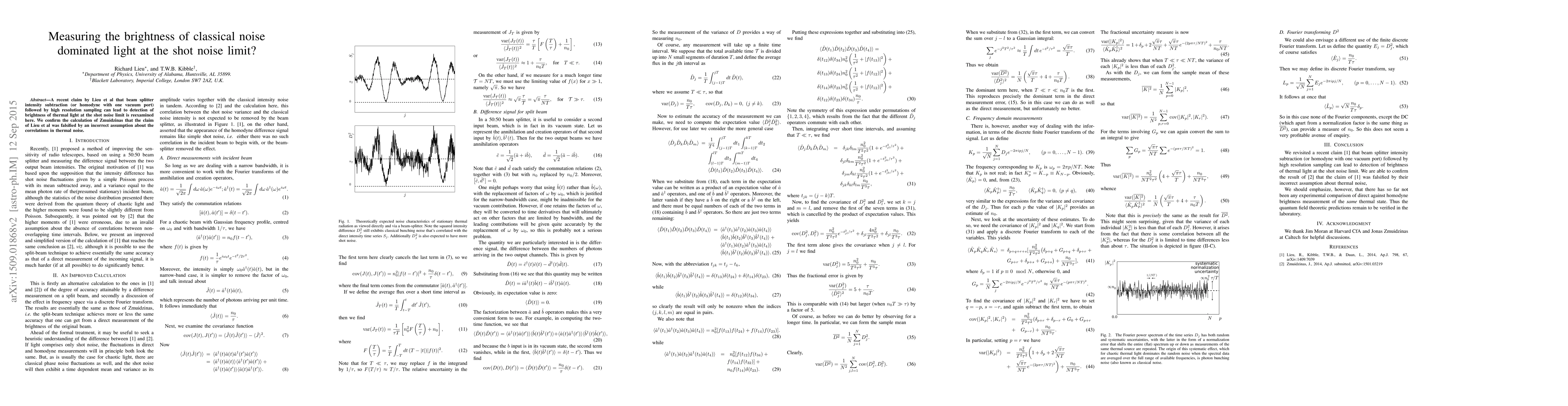 Summary: This paper reexamines Lieu et al.'s claim that beam splitter intensity subtraction can detect the brightness of thermal light at the shot noise limit, confirming Zmuidzinas's finding that the claim is invalid due to an incorrect assumption about thermal noise correlations.