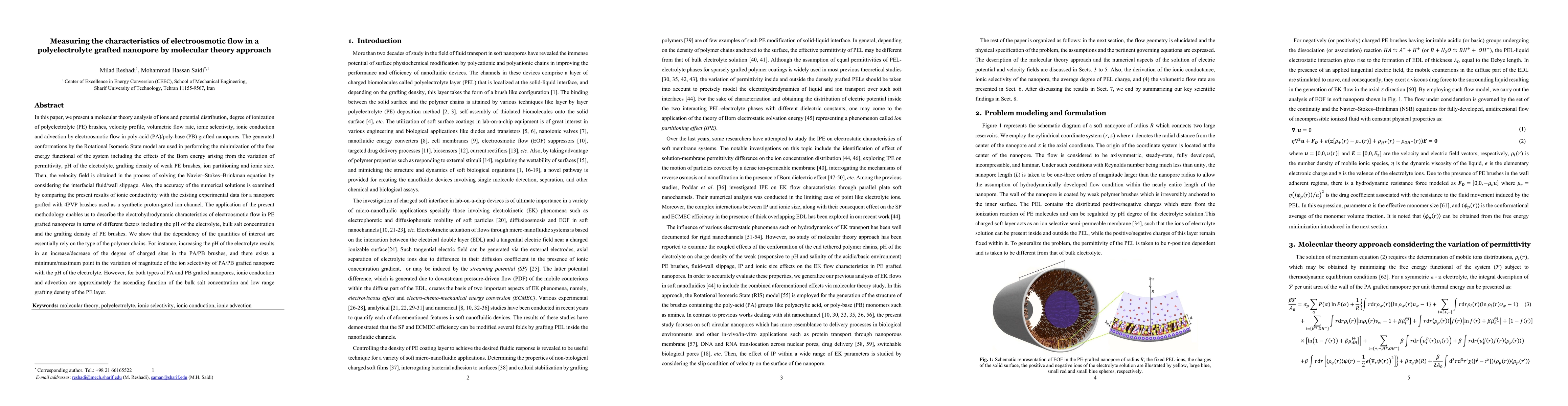 This paper employs molecular theory to analyze electroosmotic flow in polyelectrolyte grafted nanopores, focusing on ion distribution, degree of ionization, and flow characteristics. The study shows that factors like pH and grafting density significantly influence ionic conduction and selectivity, with varying effects depending on the type of polymer grafted.