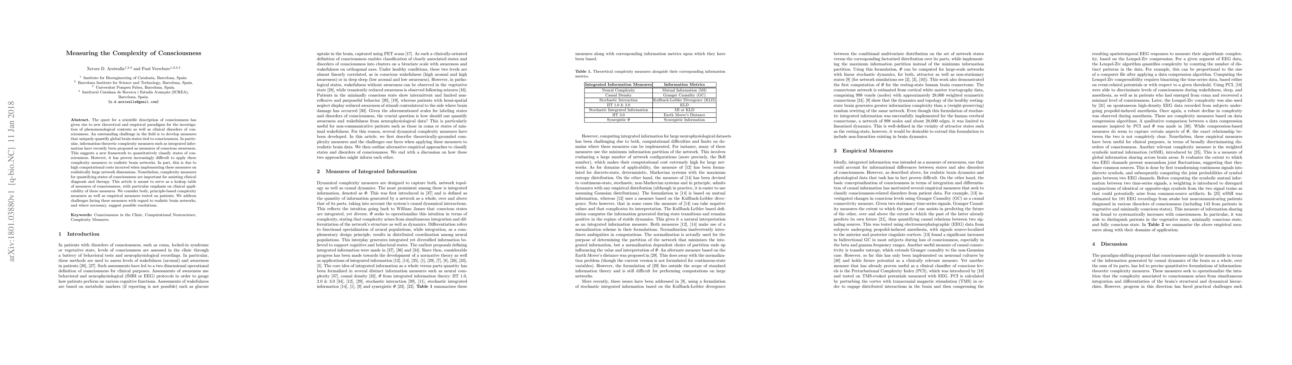 This paper reviews theoretical and empirical measures of consciousness, focusing on their clinical application. It highlights the challenges of applying complexity measures to realistic brain networks due to computational costs and discusses potential resolutions, aiming to assist in clinical diagnosis and therapy.