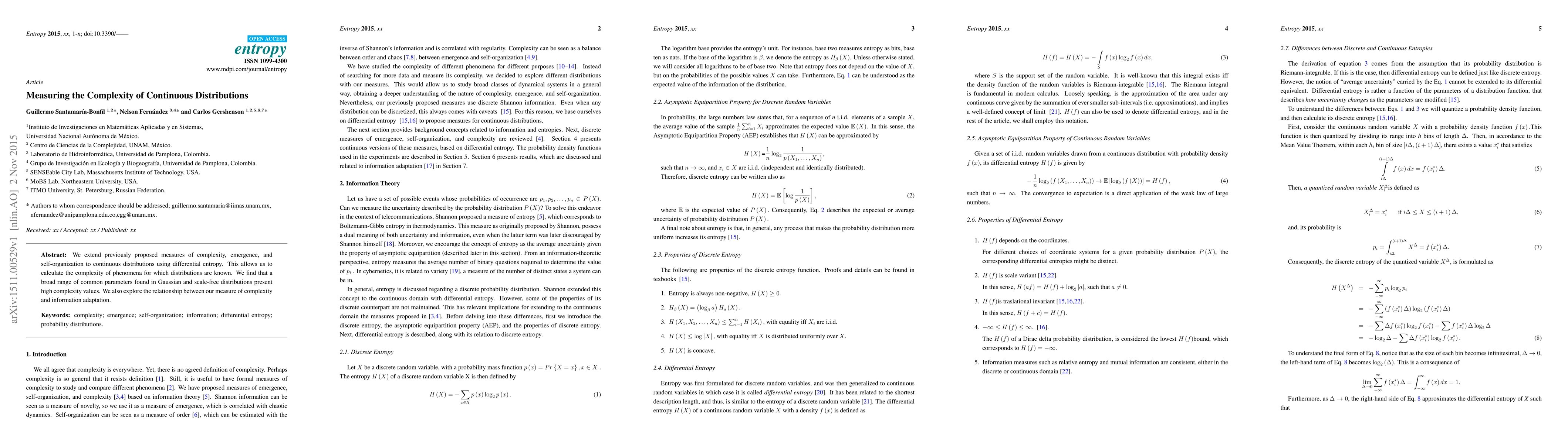 We extend previously proposed measures of complexity, emergence, and self-organization to continuous distributions using differential entropy. This allows us to calculate the complexity of phenomena for which distributions are known. We find that a broad range of common parameters found in Gaussian and scale-free distributions present high complexity values. We also explore the relationship between our measure of complexity and information adaptation.