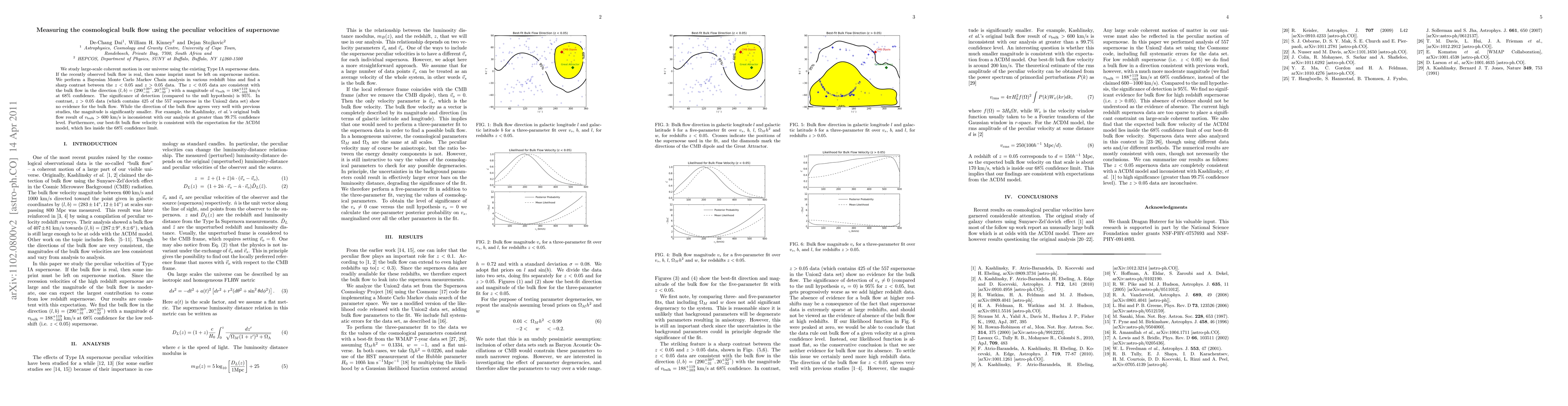 We study large-scale coherent motion in our universe using the existing Type IA supernovae data. If the recently observed bulk flow is real, then some imprint must be left on supernovae motion. We run a series of Monte Carlo Markov Chain runs in various redshift bins and find a sharp contrast between the z < 0.05 and z > 0.05 data. The$z < 0.05 data are consistent with the bulk flow in the direction (l,b)=({290^{+39}_{-31}}^{\circ}, {20^{+32}_{-32}}^{\circ}) with a magnitude of v_bulk = 188^{+119}_{-103} km/s at 68% confidence. The significance of detection (compared to the null hypothesis) is 95%. In contrast, z > 0.05 data (which contains 425 of the 557 supernovae in the Union2 data set) show no evidence for bulk flow. While the direction of the bulk flow agrees very well with previous studies, the magnitude is significantly smaller. For example, the Kashlinsky, et al.'s original bulk flow result of v_bulk > 600 km/s is inconsistent with our analysis at greater than 99.7% confidence level. Furthermore, our best-fit bulk flow velocity is consistent with the expectation for the \Lambda CDM model, which lies inside the 68% confidence limit.