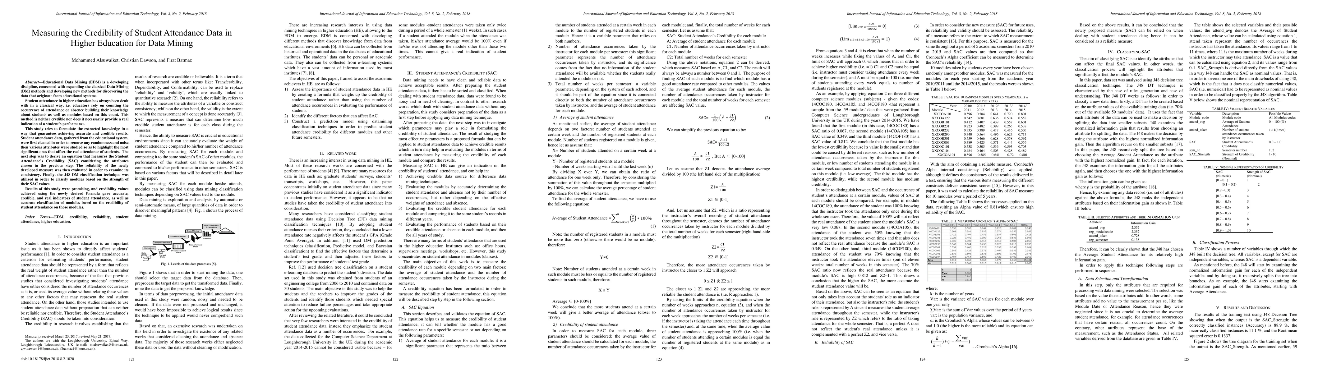 Educational Data Mining (EDM) is a developing discipline, concerned with expanding the classical Data Mining (DM) methods and developing new methods for discovering the data that originate from educational systems. Student attendance in higher education has always been dealt with in a classical way, educators rely on counting the occurrence of attendance or absence building their knowledge about students as well as modules based on this count. This method is neither credible nor does it necessarily provide a real indication of a student performance. This study tries to formulate the extracted knowledge in a way that guarantees achieving accurate and credible results. Student attendance data, gathered from the educational system, were first cleaned in order to remove any randomness and noise, then various attributes were studied so as to highlight the most significant ones that affect the real attendance of students. The next step was to derive an equation that measures the Student Attendance Credibility (SAC) considering the attributes chosen in the previous step. The reliability of the newly developed measure was then evaluated in order to examine its consistency. Finally, the J48 DM classification technique was utilized in order to classify modules based on the strength of their SAC values. Results of this study were promising, and credibility values achieved using the newly derived formula gave accurate, credible, and real indicators of student attendance, as well as accurate classification of modules based on the credibility of student attendance on those modules.
