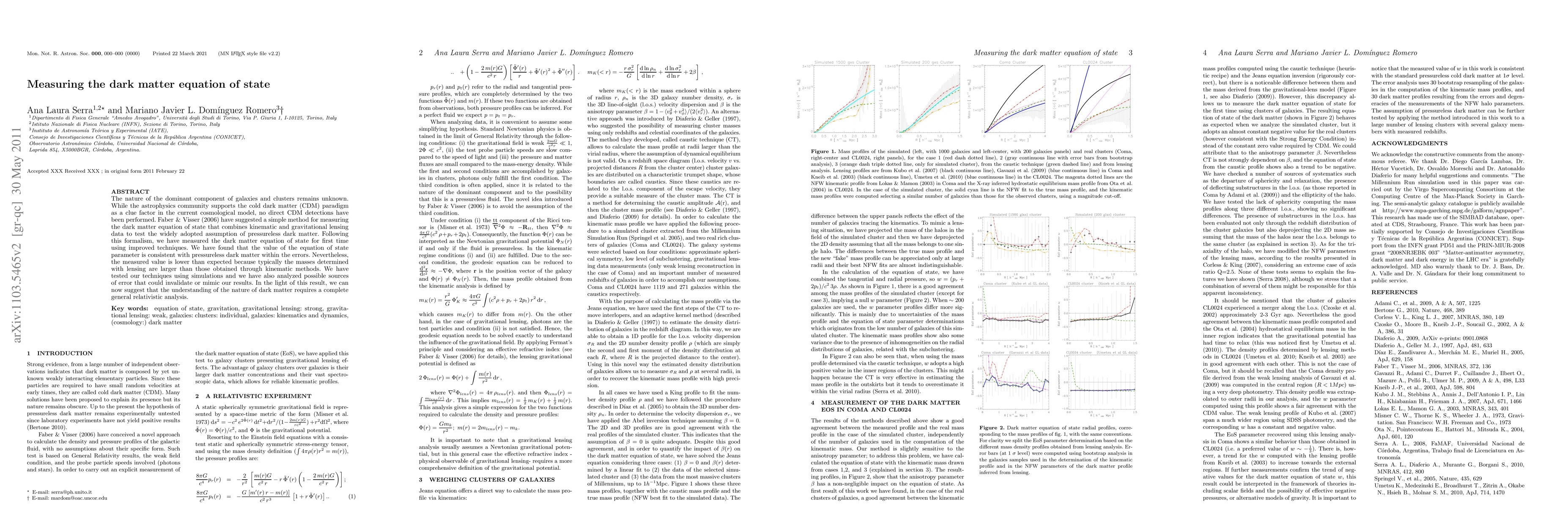 This paper measures the dark matter equation of state using advanced techniques combining kinematic and gravitational lensing data, finding results consistent with pressureless dark matter but lower than expected. The study suggests a need for a general relativistic analysis to better understand dark matter.