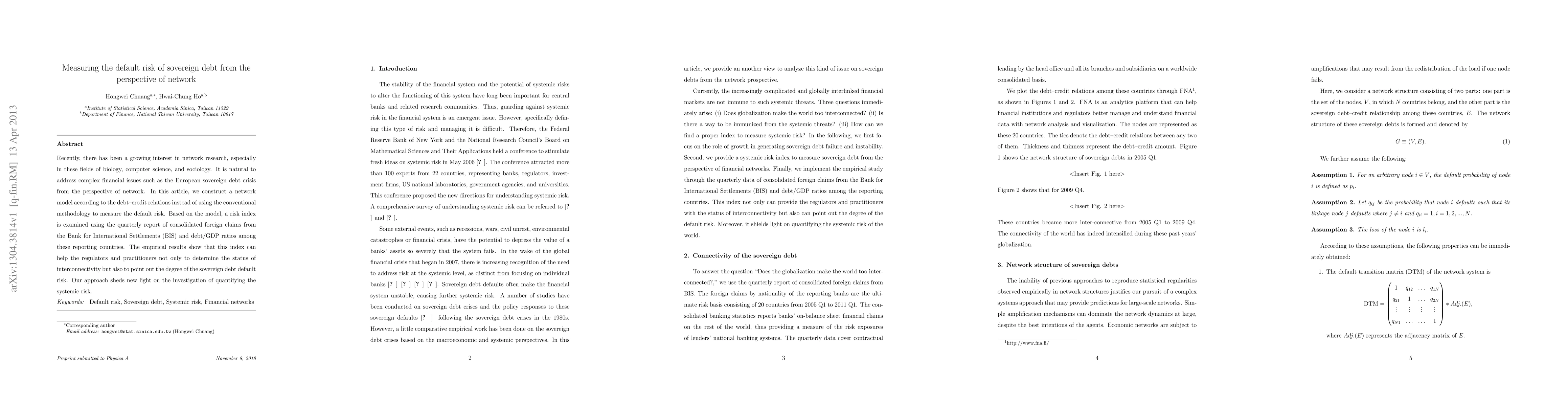 This paper constructs a network model based on debt-credit relations to assess sovereign debt default risk, using data from the Bank for International Settlements. The proposed risk index reveals interconnectivity and default risk levels, offering a novel approach to systemic risk quantification.