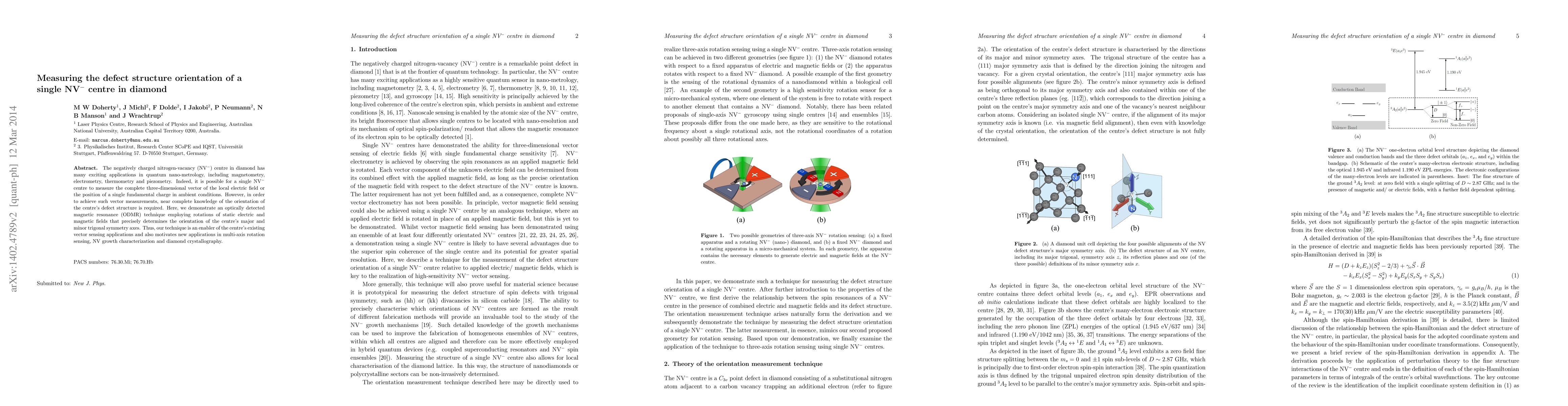 The negatively charged nitrogen-vacancy (NV-) centre in diamond has many exciting applications in quantum nano-metrology, including magnetometry, electrometry, thermometry and piezometry. Indeed, it is possible for a single NV- centre to measure the complete three-dimensional vector of the local electric field or the position of a single fundamental charge in ambient conditions. However, in order to achieve such vector measurements, near complete knowledge of the orientation of the centre's defect structure is required. Here, we demonstrate an optically detected magnetic resonance (ODMR) technique employing rotations of static electric and magnetic fields that precisely determines the orientation of the centre's major and minor trigonal symmetry axes. Thus, our technique is an enabler of the centre's existing vector sensing applications and also motivates new applications in multi-axis rotation sensing, NV growth characterization and diamond crystallography.
