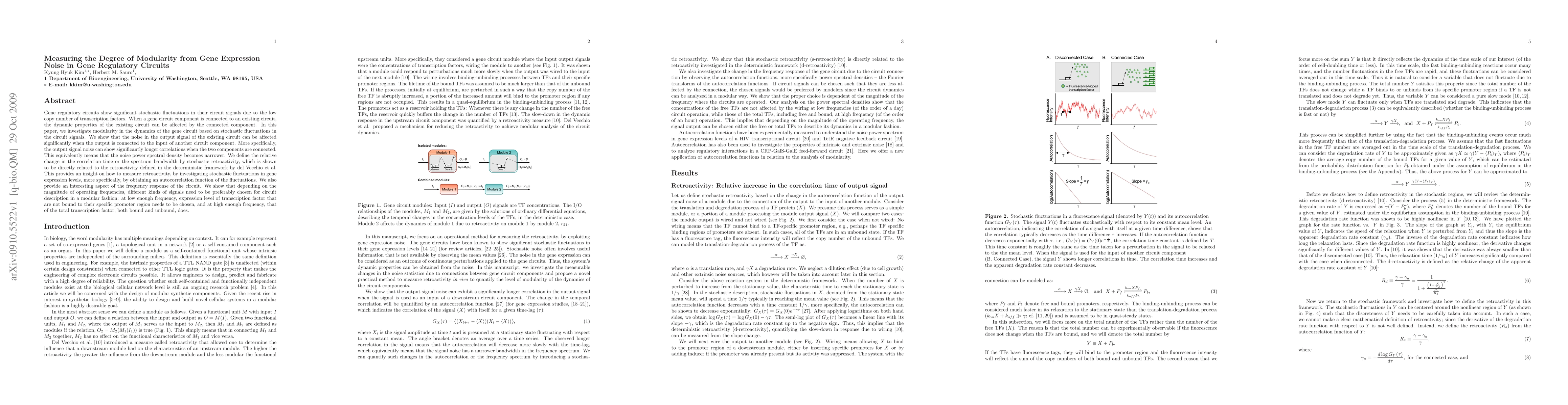 This paper investigates modularity in gene regulatory circuits by analyzing stochastic fluctuations in gene expression noise. It demonstrates that the noise in circuit signals correlates with the dynamic properties of existing circuits when new components are added, showing longer noise correlations and narrower noise power spectral density, termed "stochastic retroactivity." This method provides insight into measuring retroactivity through autocorrelation functions of gene expression fluctuations.