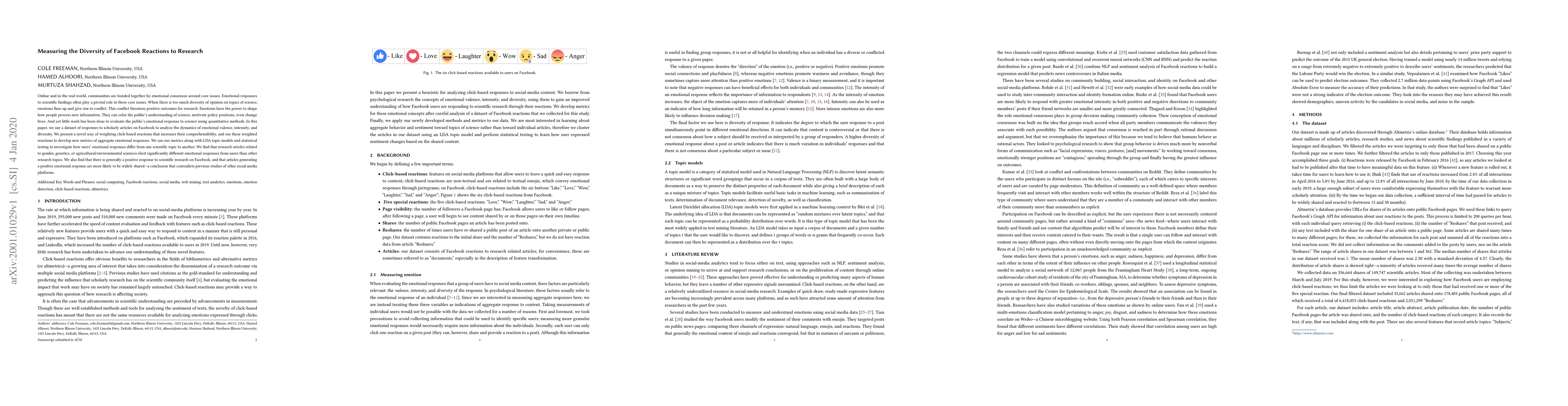 This paper analyzes Facebook reactions to scholarly articles to measure emotional valence, intensity, and diversity, finding significant differences in responses across scientific topics like gender, genetics, and agricultural/environmental sciences. It concludes that positive emotional responses to scientific research are more likely to be widely shared on Facebook, contrary to findings on other social media platforms.
