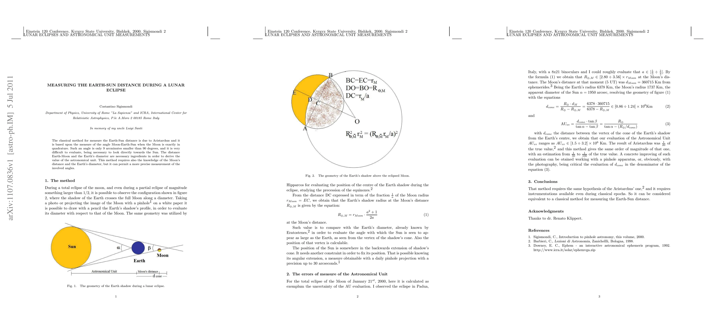 The classical method for measure the Earth-Sun distance is due to Aristarchus and it is based upon the measure of the angle Moon-Earth-Sun when the Moon is exactly in quadrature. Such an angle is only 9 arcminutes smaller than 90 degrees, and it is very difficult to evaluate, being necessary to look directly towards the Sun. The distance Earth-Moon and the Earth's diameter are necessary ingredients in order to derive the value of the astronomical unit. This method requires also the knowledge of the Moon's distance and the Earth's diameter, but it can permit a more precise measurement of the involved angles.
